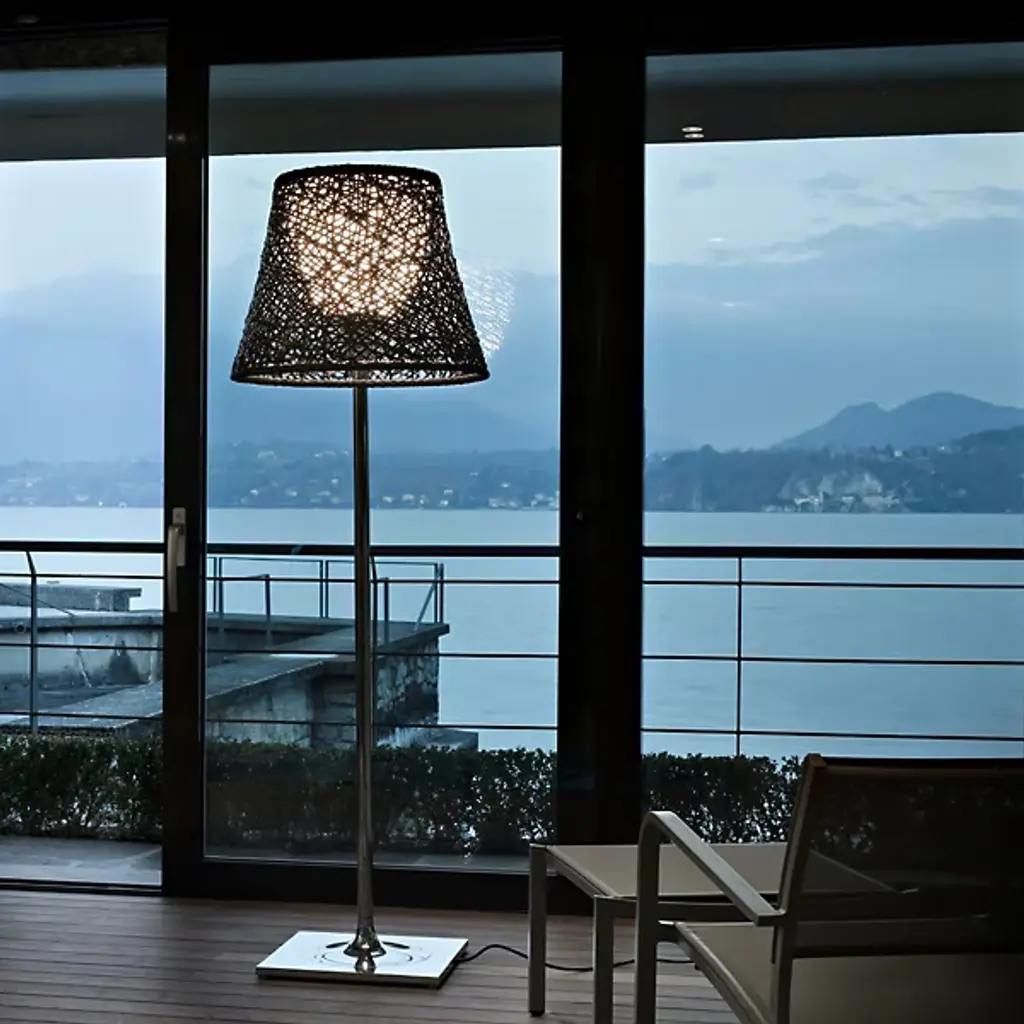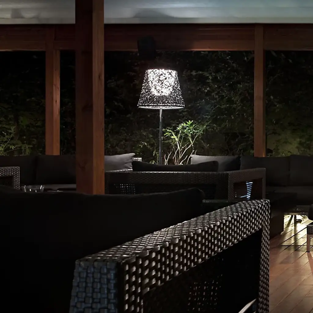 The cool style of Ktribe made just for the outdoors. The Flos Ktribe F3 Outdoor Floor Lamp is suitable for all weather with a braided PVC tube shade (available in a solid Green Wall color or two-toned Panama) and a water-resistant inner polycarbonate diffuser. The stem and base are made of durable die-cast aluminum and steel and coated in gleaming chrome.