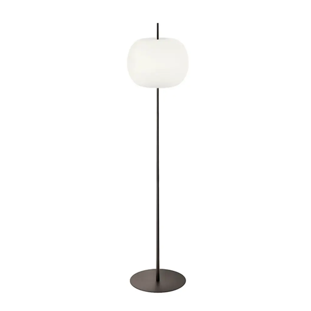 Delectable and striking like standing Yakitori skewers pulled fresh from a hot burning grill. An ode to Japanese cuisine, the Kushi XL Floor Lamp from Kundalini creates a welcoming atmosphere and a sculptural silhouette one can appreciate from any viewing angle. Design duo Alberto Saggia & Valerio Sommella approach this piece with formal, material, technological, and functional innovation in mind. Formally, the piece feels balanced as it arranges its skewer-like structure in a tripod composition. The dynamic lines of the structure break up the strict 90-degree angles of the modern space. Mouth-blown glass shades add an artful presence to the room in their rounded, opaque forms. The light evenly paints the glass and filters through to create a radiant display and an evocative silhouette.