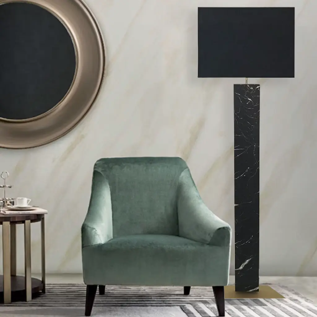 This superb floor lamp was made by hand by expert artisans using Noir marble, whose luxurious fine surface is covered in thin white and golden veins. The structure in brass complements the stone and comprises a square base and an internal shaft. The black linen shade at the top continues the geometric patterns of this striking silhouette. This piece will make a statement in any decor, enriching any room with sophistication and modern allure.