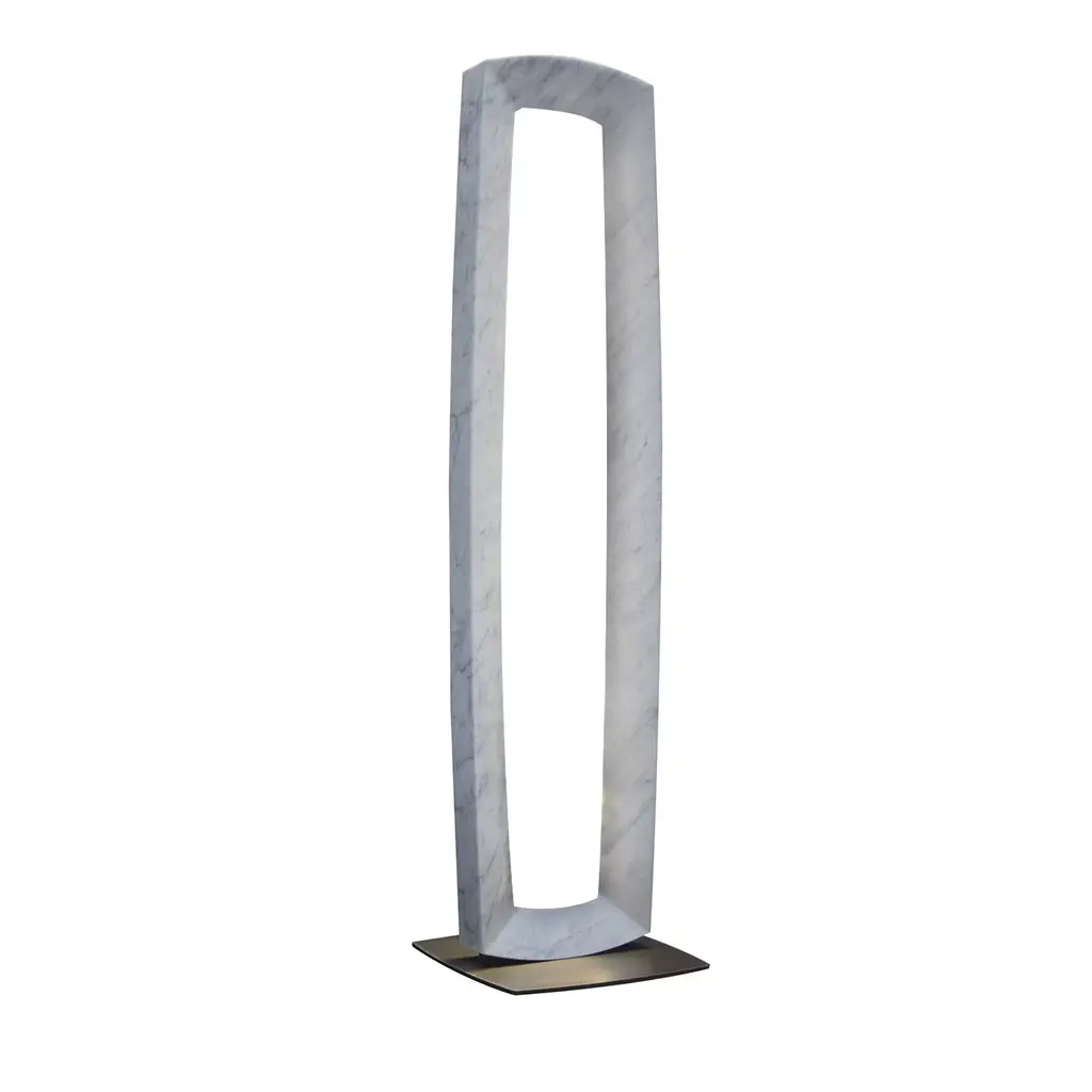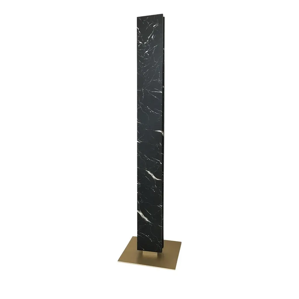 This magnificent floor lamp was entirely made by expert craftsmen using artisanal methods and it will enhance the look of any decor thanks to its exquisite execution and its use of precious materials. Its timeless allure is given by its Minimalist Silhouette made of a squared base and structure in brushed brass that splendidly complements the body of the lamp in black Saint Laurent marble, with its white and golden veins. The light runs vertically on both sides and on the top of the piece.