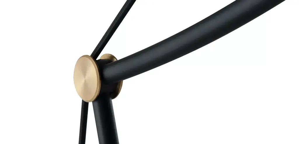 Angled floor lamp in lacquered steel, col. matte black, with brass inserts. Lampshade in translucent blown glass, col. amber.