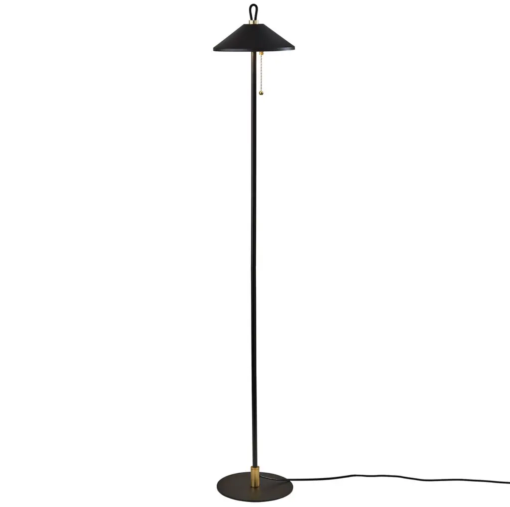 The Lacey floor lamp by Eglo features a structured black finish w/ a natural wood accent. The metal shade is adjustable and has a structured black exterior and white interior finish. The black plug in cord measures 59" long