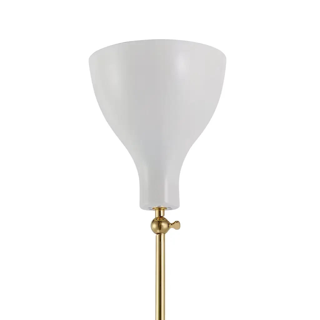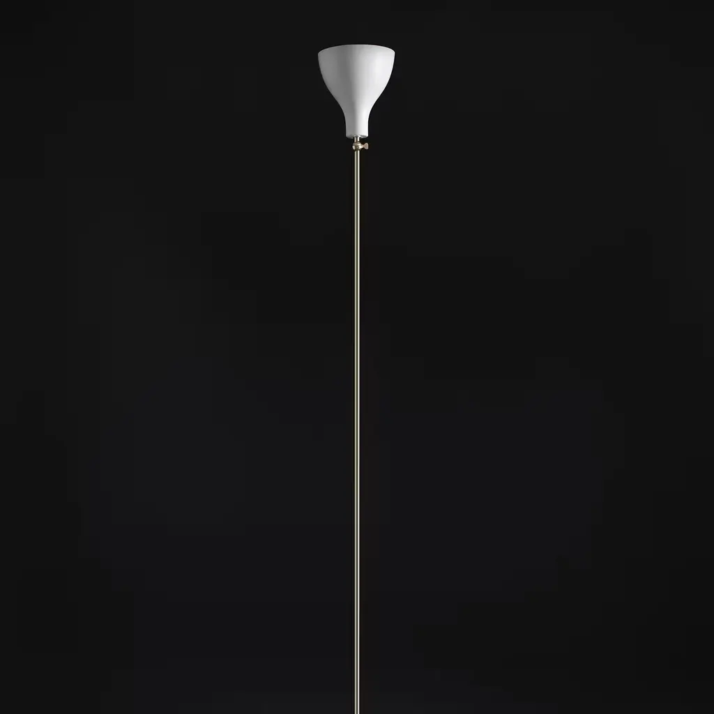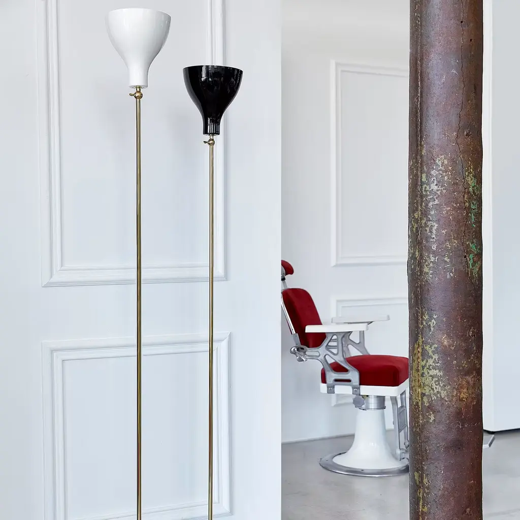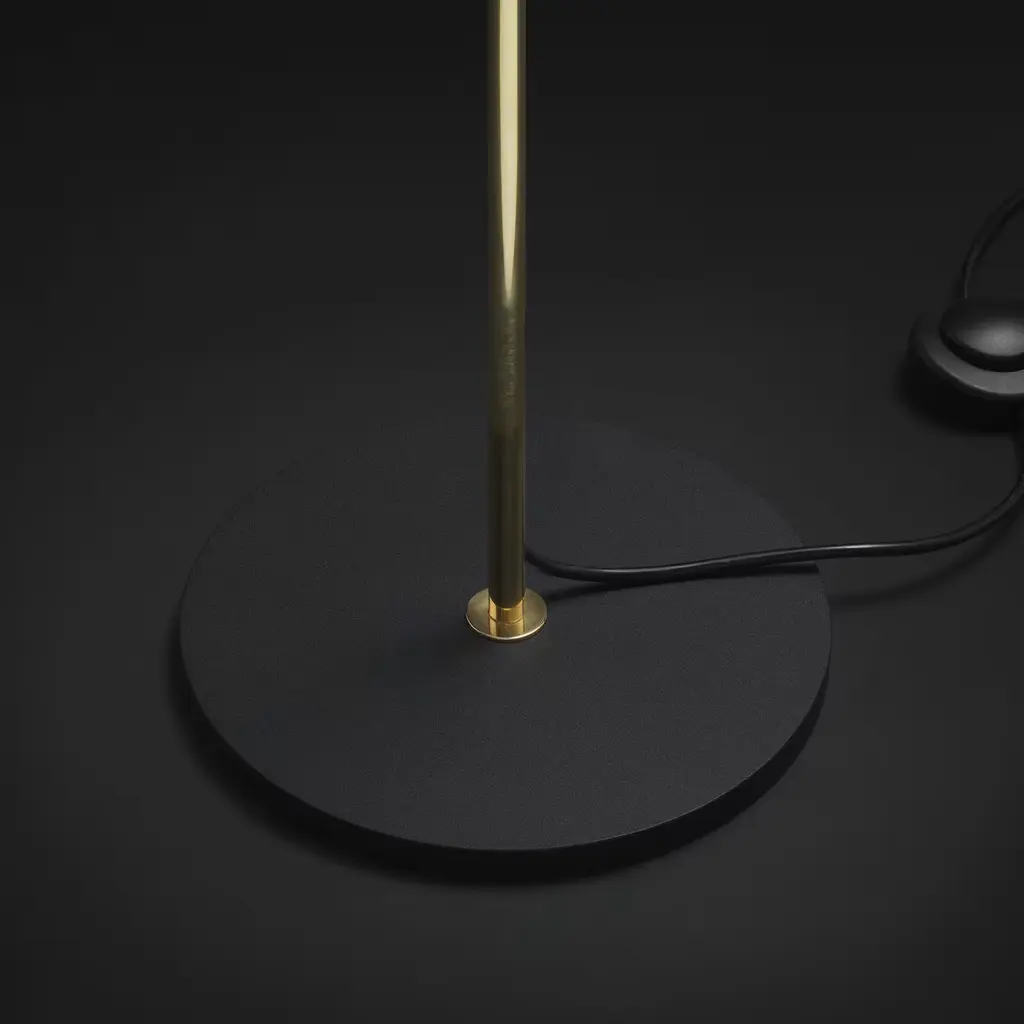 Part of the Lady V collection, inspired by the understated sensuality of the modern woman, this floor lamp is bold and elegant, boasting contrasting colors and finishes for a striking effect. The steel base in black matte finish supports a simple arm in polished brass that stems vertically toward the shade in glossy white lacquer. The harmonious coexistence of these elements creates a superb effect that will be eye-catching and unique.