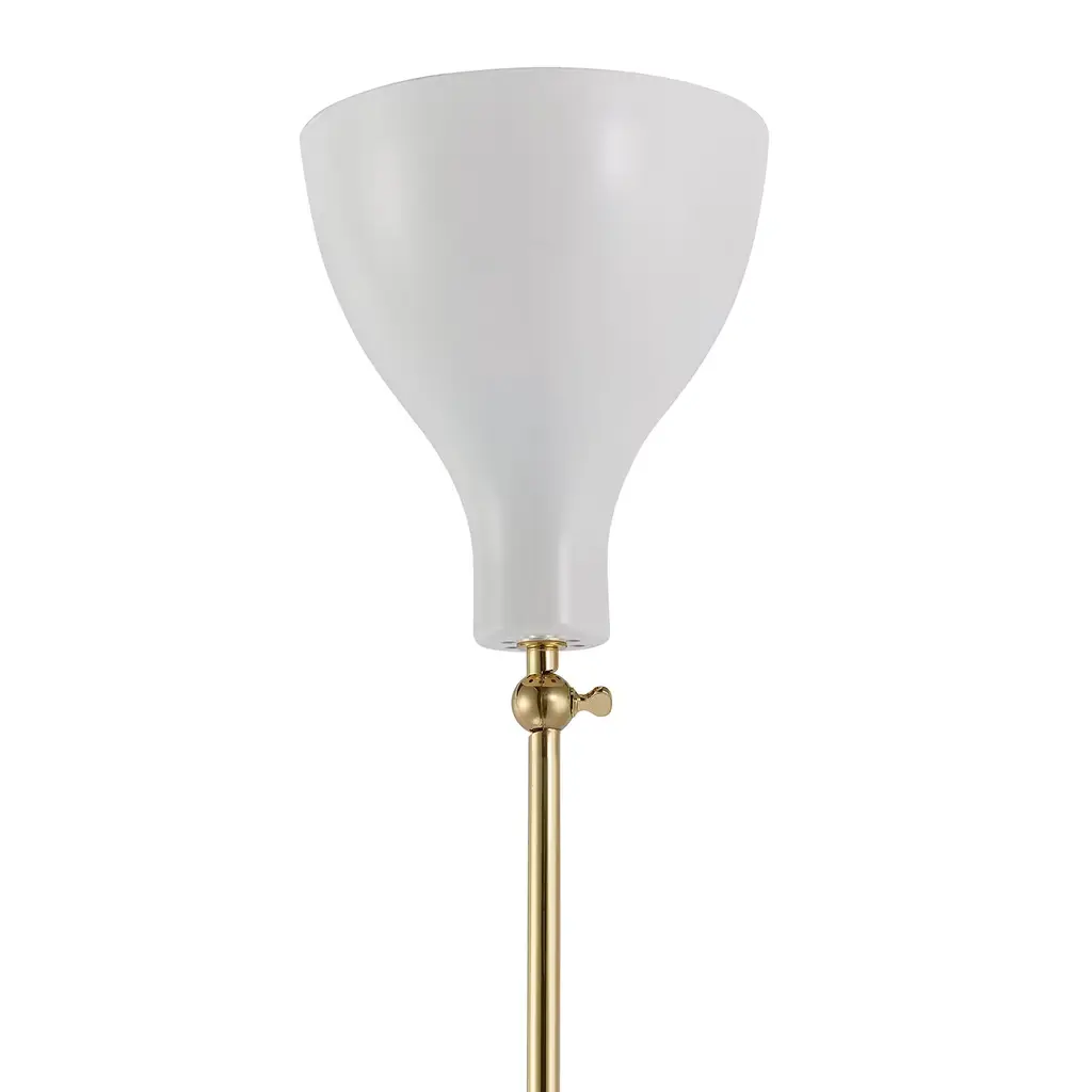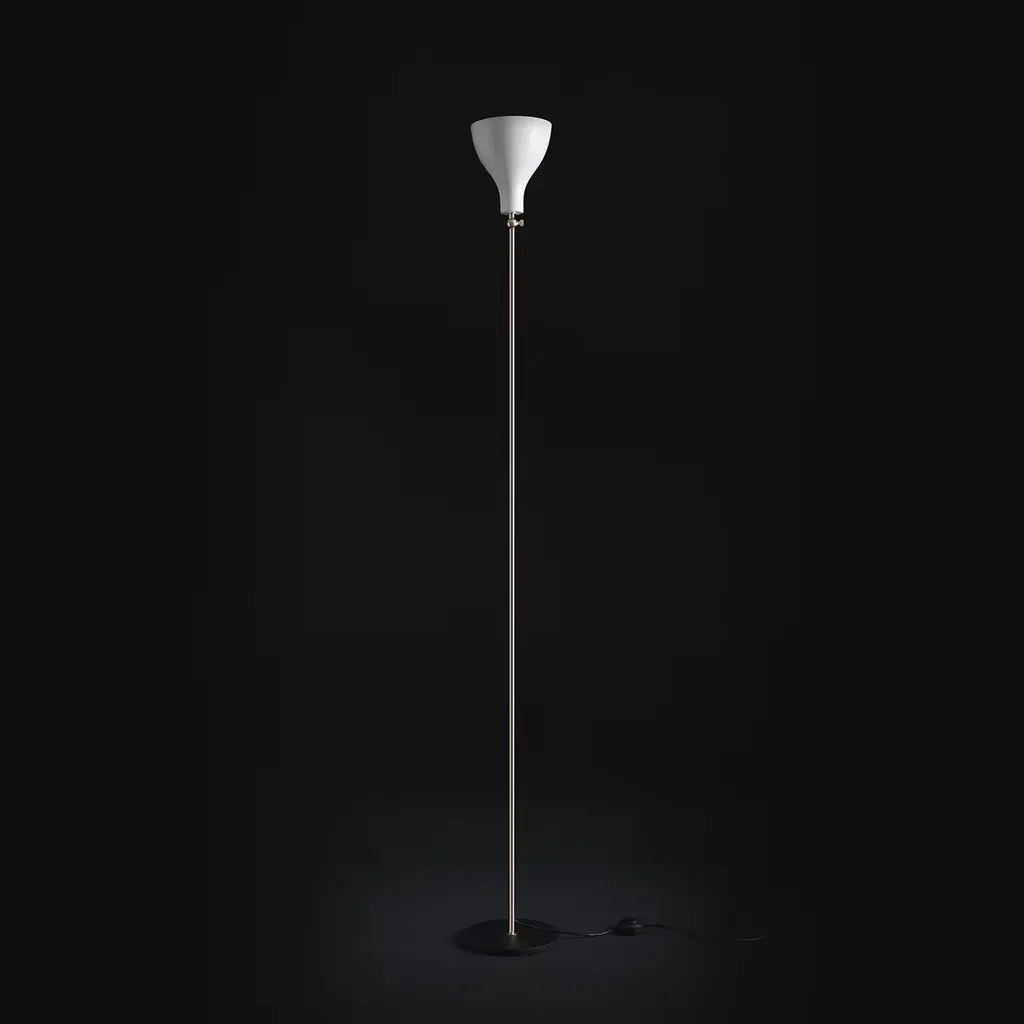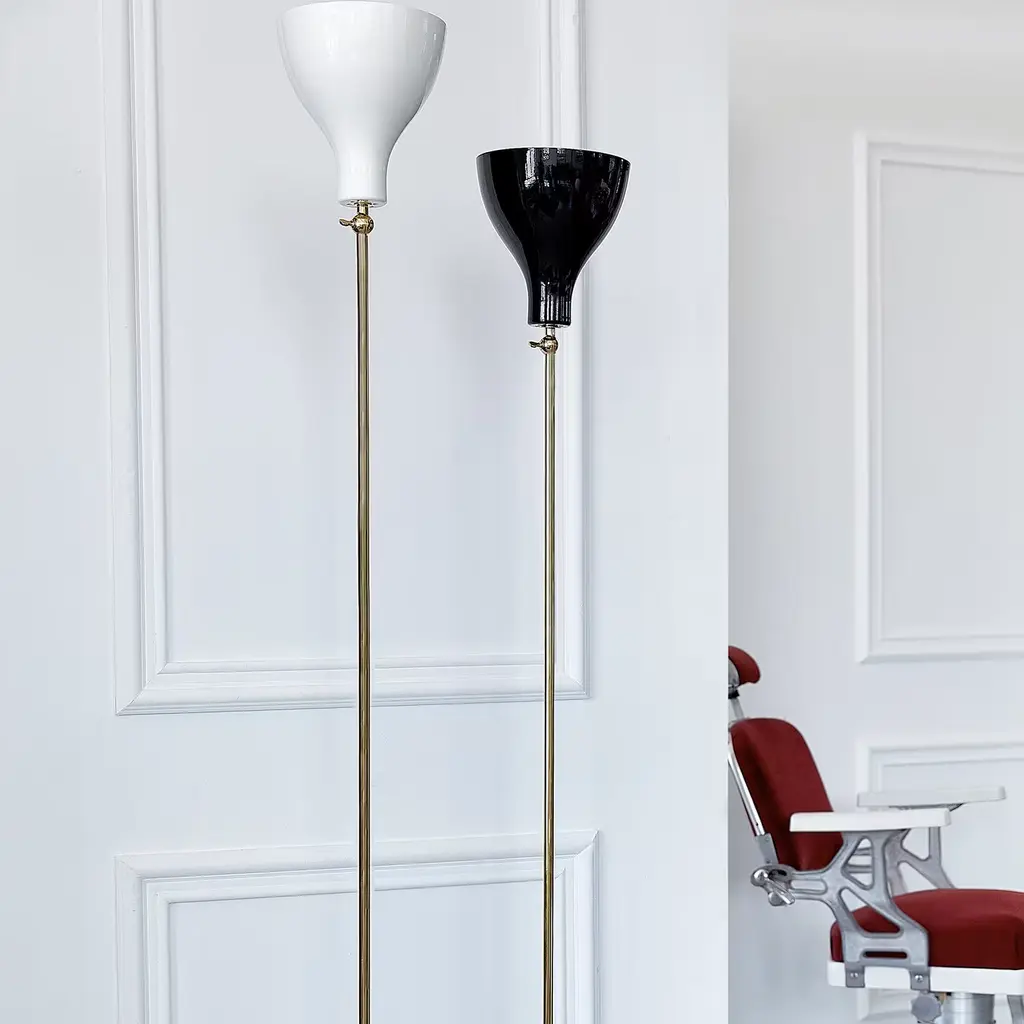 The opaque black of the steel base meets the polished brass of the structure supporting the white glossy lacquer of the shade, in this piece that is a striking exercise in contrasts. Inspired by the allure of the modern woman, this floor lamp will be an exquisite addition to a contemporary home, where it can be placed next to an armchair in the study, entryway or living room. The shade can be positioned in different directions.