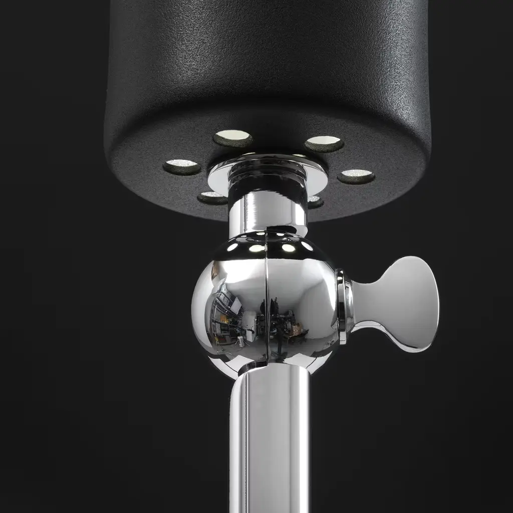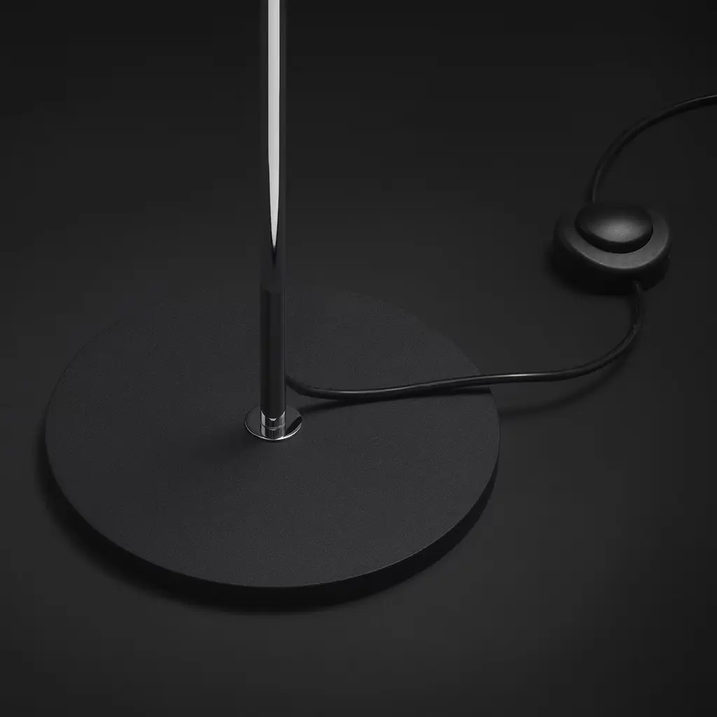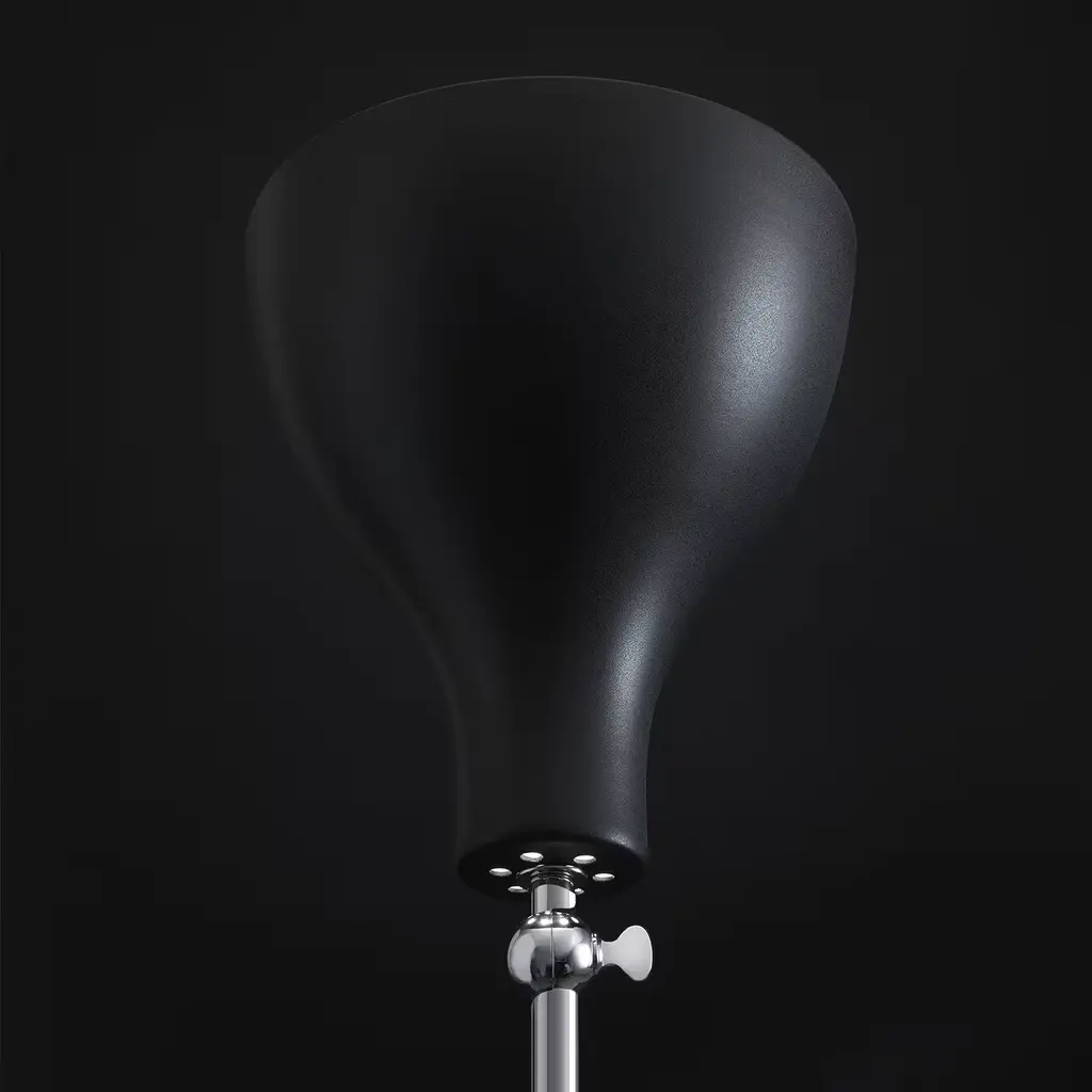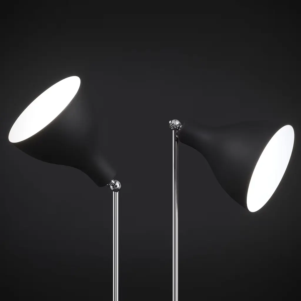 This stunning floor lamp is part of the Lady V collection, inspired by the svelte silhouette of a woman. Its strong visual impact is due to the elegant, glossy chrome body that rests on a base in opaque black steel. The shade, with a textured black varnish, can be positioned at will to create a striking ambiance in a contemporary home, either alone or combined with other items in the same series for a cohesive look.