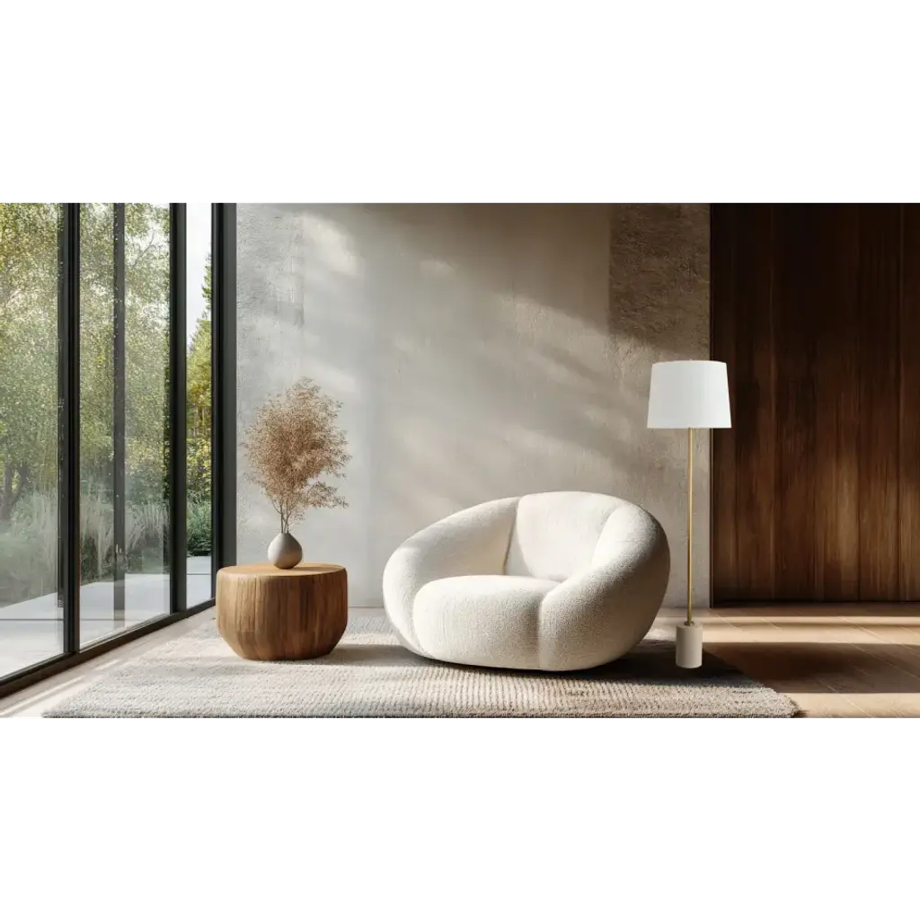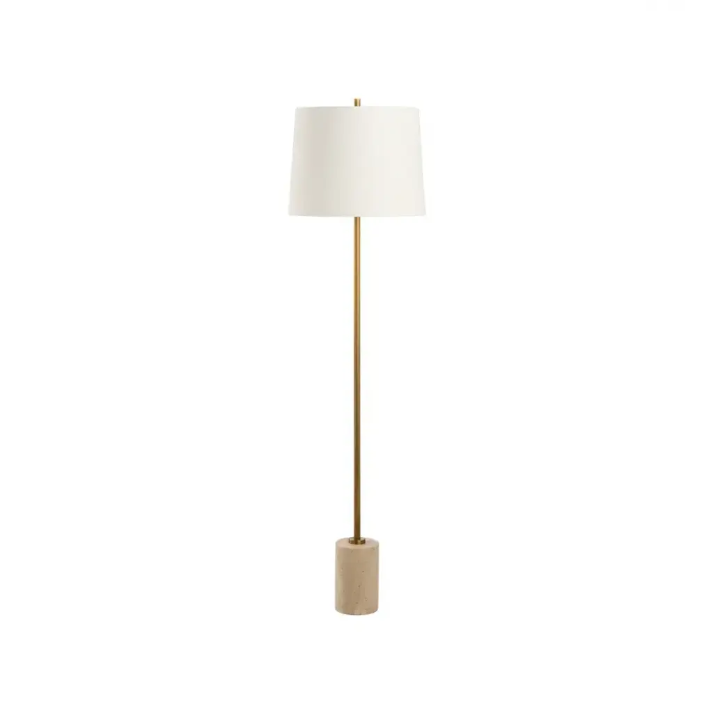 This contemporary floor lamp features a travertine base accented by a sleek metal body in a rich gold finish. Its minimalist design and refined shade create a warm, elegant glow, blending modern style with timeless luxury. Designed by Jamie Merida.