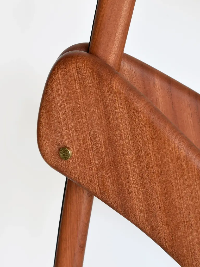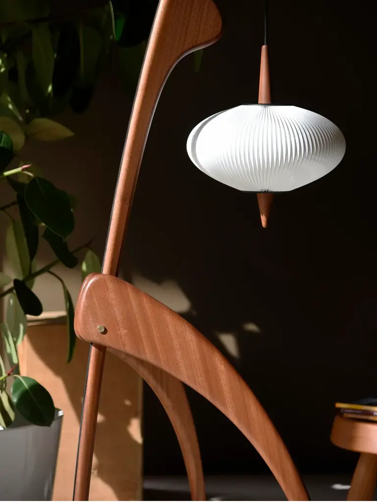 Large Rispal 'Praying Mantis' Sculptural Floor Lamp in Mahogany. The iconic model #14.950 was originally designed in 1950 by François Rispal. This newly produced authorized re-edition is executed in richly grained mahogany with a signed "Rispal" brass detail where the body and legs intersect. The shade is made from pleated cellulose acetate, consistent with the original material, and ingeniously shaped through a unique process developed by the Rispal house in the 1950s. Made in France using many of the same small-scale manufacturing techniques, scrupulous attention to detail, materials and craftsmanship as the original. The avant-gardism of Rispal is exemplified by the Praying Mantis, a name actually coined over the years by antique dealers and decorators. The 'Praying Mantis' has become a timeless and sculptural icon of the golden age of French design much sought after by collectors in the know. The Rispal brand was recently relaunched by Douglas Mont, a respected artist, lighting designer and passionate Rispal collector. After years of assiduous research and experimentation, he relaunched Rispal with the help of Clément Bergès and Georgette Rispal, daughter of the company founder, reviving iconic designs from the golden age of French furniture. Professionally modified for compatibility with US electrical. Ships with black cloth cord and US period-style wall plug. Accommodates 3x 5W G9 LED bulbs. Not UL listed. Three lamps in stock. Standard in-stock lead time 2-3 weeks. Out of stock can add additional 8 weeks or longer. Please note that availability can change at any time. Kindly inquire prior to placing time sensitive orders. Please note only one representative example shown in images. Wood grain can vary from item to item due to the organic nature of the material. Made to order.