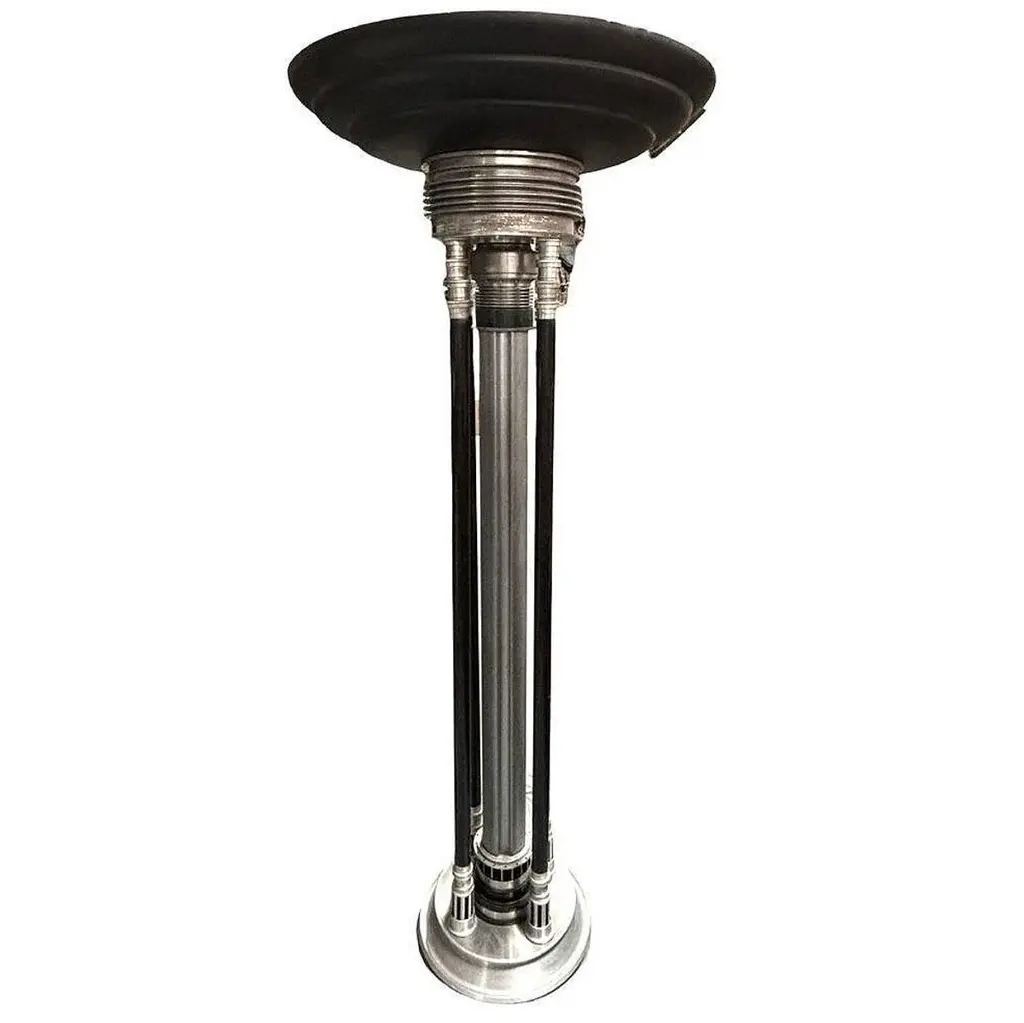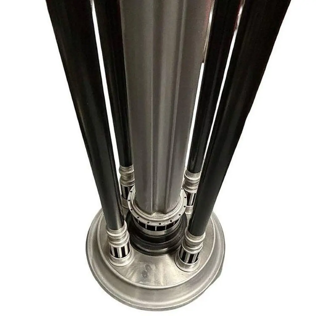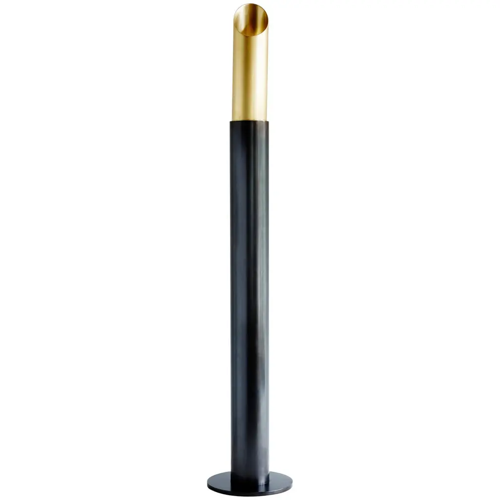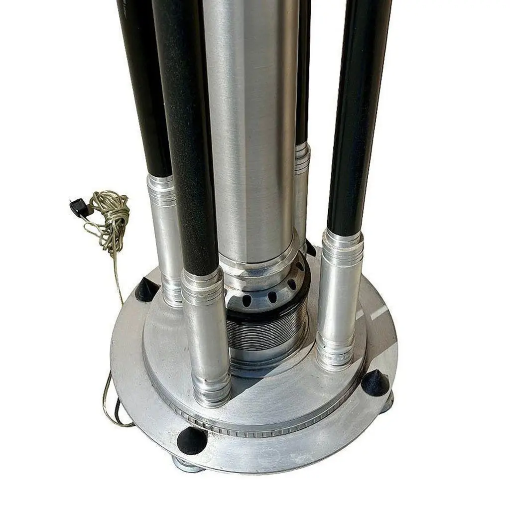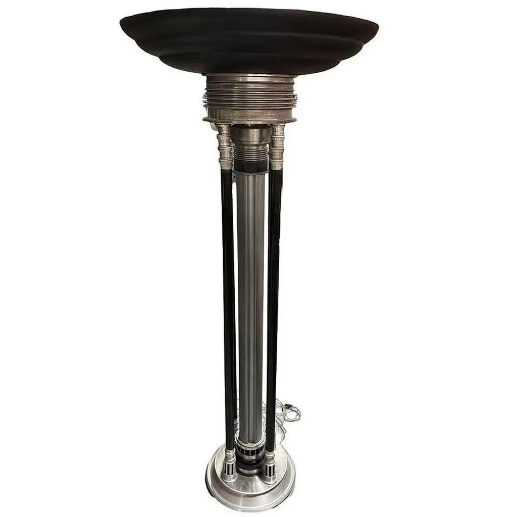 Renowned artist Rick Ramirez fashioned distinctive, towering floor lamps in the Art Deco style, each a singular creation. His hallmark aesthetic seamlessly blended artisanal craftsmanship with recycled aerospace parts, imbuing every lamp with a mesmerizing charm.Ramirez's fusion of artistry and ingenuity testified to his limitless imagination and adaptability. Each lamp witnessed his prowess in repurposing aerospace components into captivating artworks. In Ramirez's vision, these lamps surpassed mere utility, emerging as icons of artistic ingenuity and technological reinvention, symbolizing the intersection of creativity and innovation.Large 80" tall pair of Art Deco StyleAvailable- 2 (price for one)Dimensions: Height: 75", Top Diameter: 31", Base Diameter: 17"United States, 1980