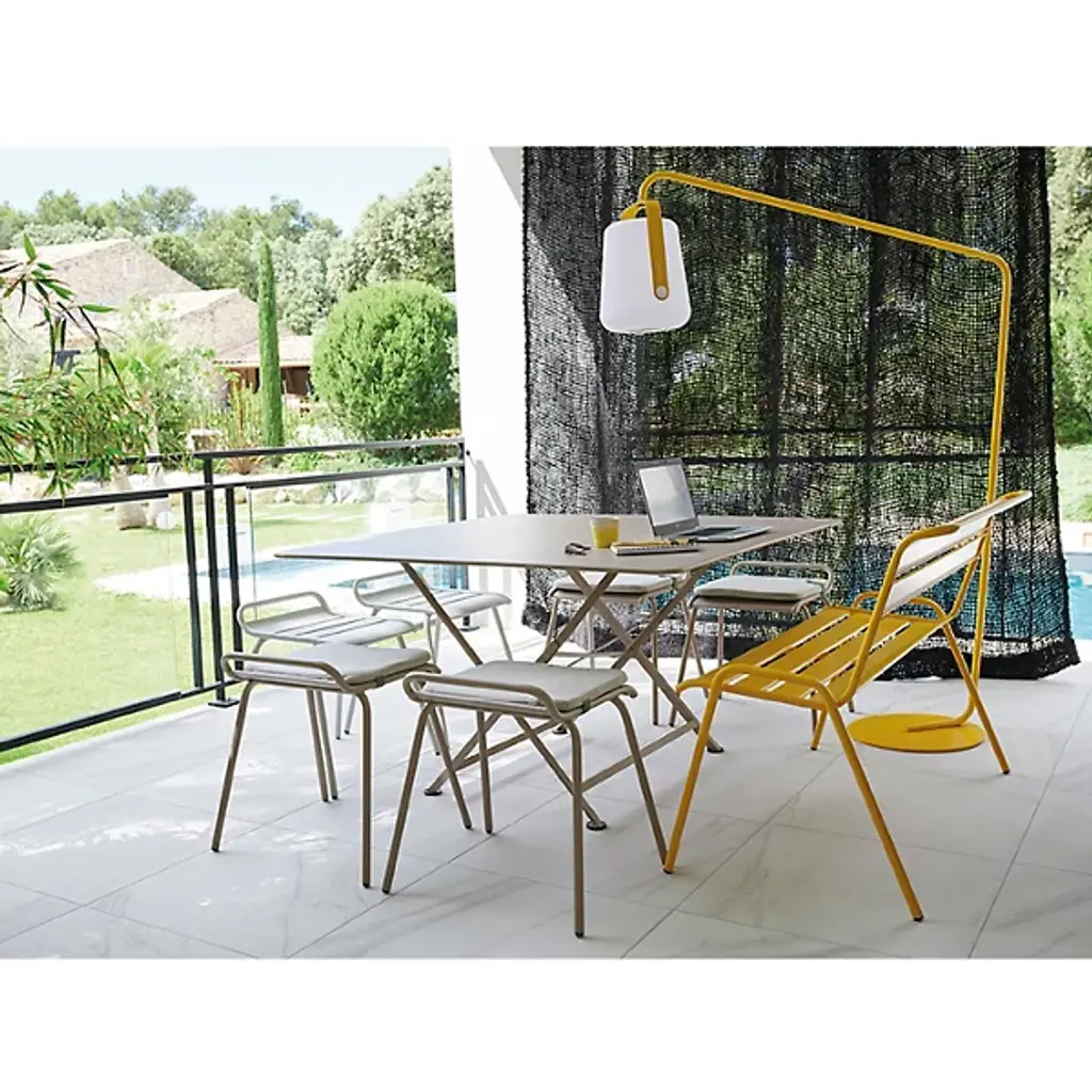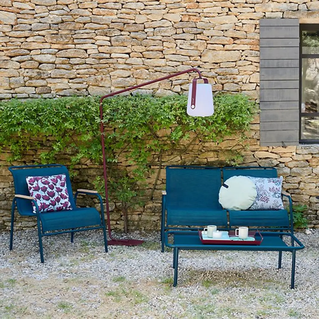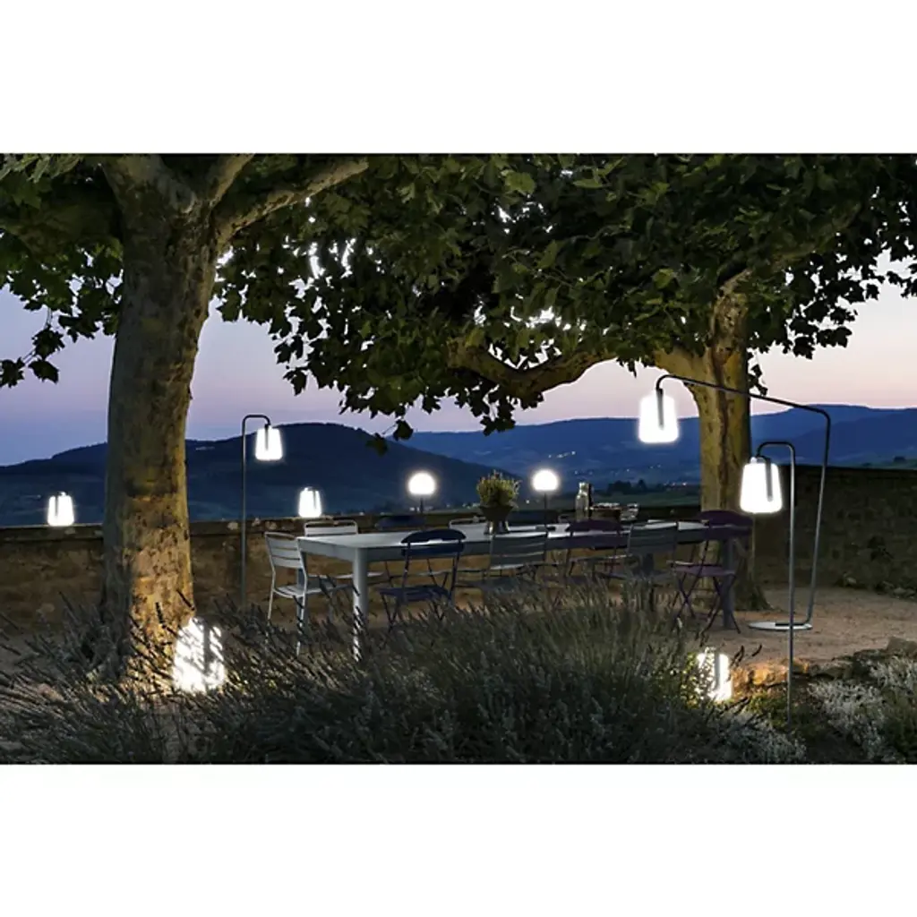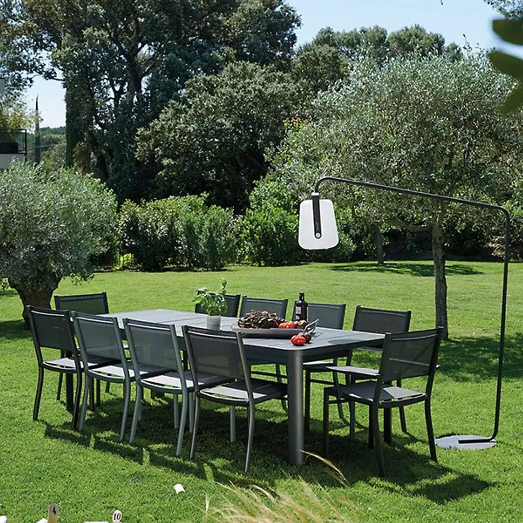 The Fermob Large Balad Offset Stand effectively turns your handheld Balad Lamp into a full-sized arcing floor lamp. It is made entirely out of steel, available in a range of powder coat finishes. A special clip and rubber pad are designed to hold the large (15 in) Balad Lamp securely in place over an outdoor table or sofa.