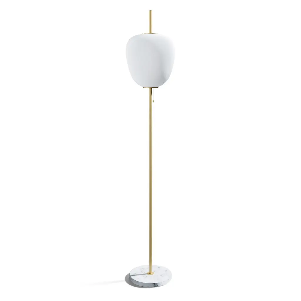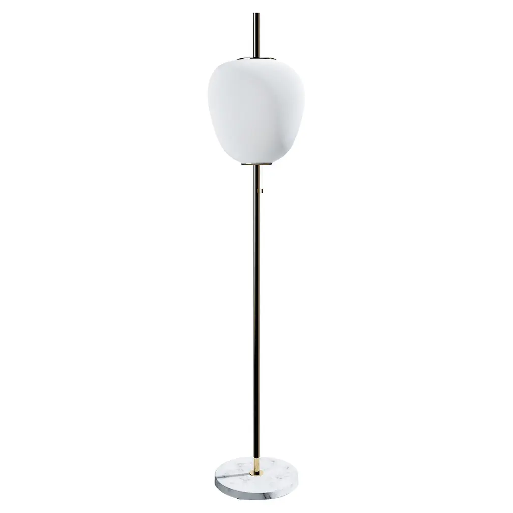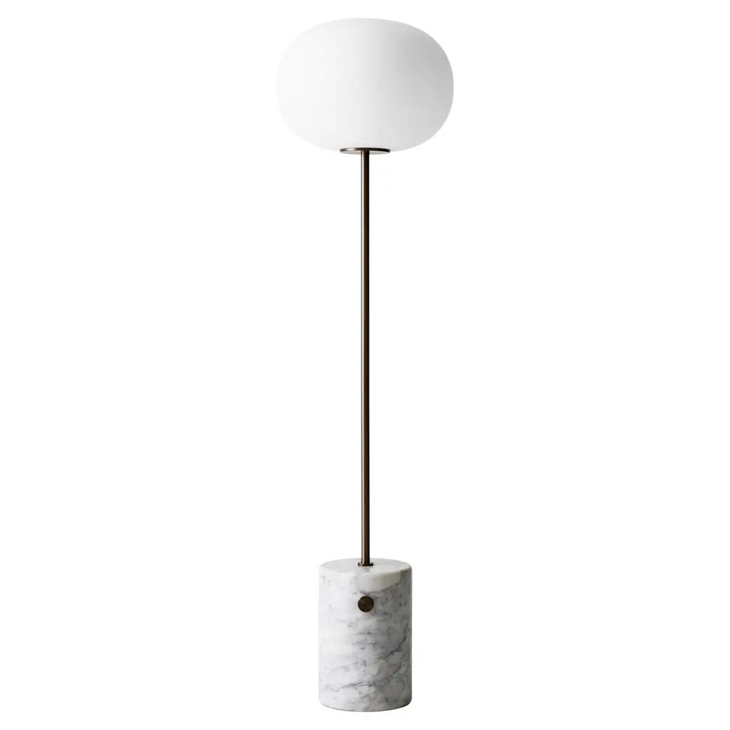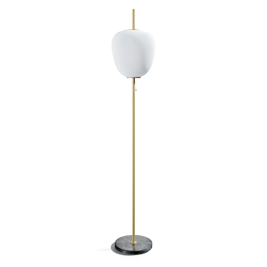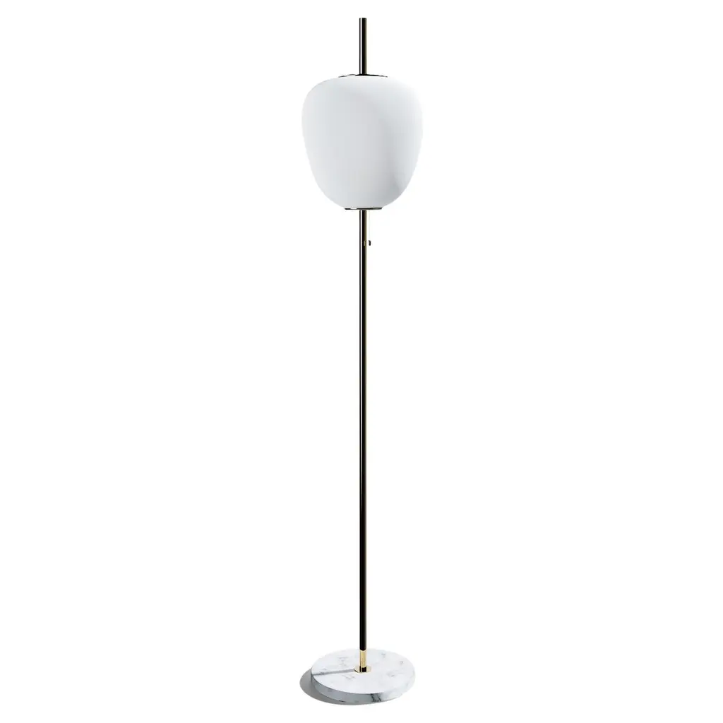 Large Joseph-André Motte J14 floor lamp in brushed brass and gray marble for Disderot. Originally designed in 1957, this sculptural floor lamp is a newly produced numbered edition with authentication certificate made in France by Disderot with many of the same small-scale manufacturing techniques and craftsmanship as the original run. Executed in high quality metal, marble and double layer opaline glass.Joseph-André Motte was born in 1925 in the Hautes-Alpes but it was in Paris at the School of Applied Arts to Industry that he studied under the direction of Louis Sognot and Rene Gabriel, two of the great masters of French modernity. He graduated from his class in 1948 and in 1952 he joined the studio of the third French master, Marcel Gascoin. It is there that he meets Pierre Guariche and Michel Mortier with whom he develops a friendship and a deep professional complicity. Together they created the Atelier de Recherche Plastique (ARP) in 1954 to present French-made practical, comfortable, modern furniture at a reasonable price. His great capacity for formal invention is often copied, and his style remains emblematic of French twentieth century design.Price is per item. Comes in manufacturer's box with “Certificate of Authenticity”. Available in unlimited quantities in choice of gunmetal, chrome, polished or brushed brass stem as well as gray or black marble base. Also available in a smaller 64.9" tall model. Please note that marble can vary from item to item due to the organic nature of the material.Accommodates 1x 75W equivalent standard medium base LED bulb. Not UL listed, but recommended UL listing possible from authorized 3rd party vendor upon request for an additional fee.In-stock lead-time 7-8 weeks. Out of stock can take up to 12 weeks or more. Stock availability can change at any time. Made to order.