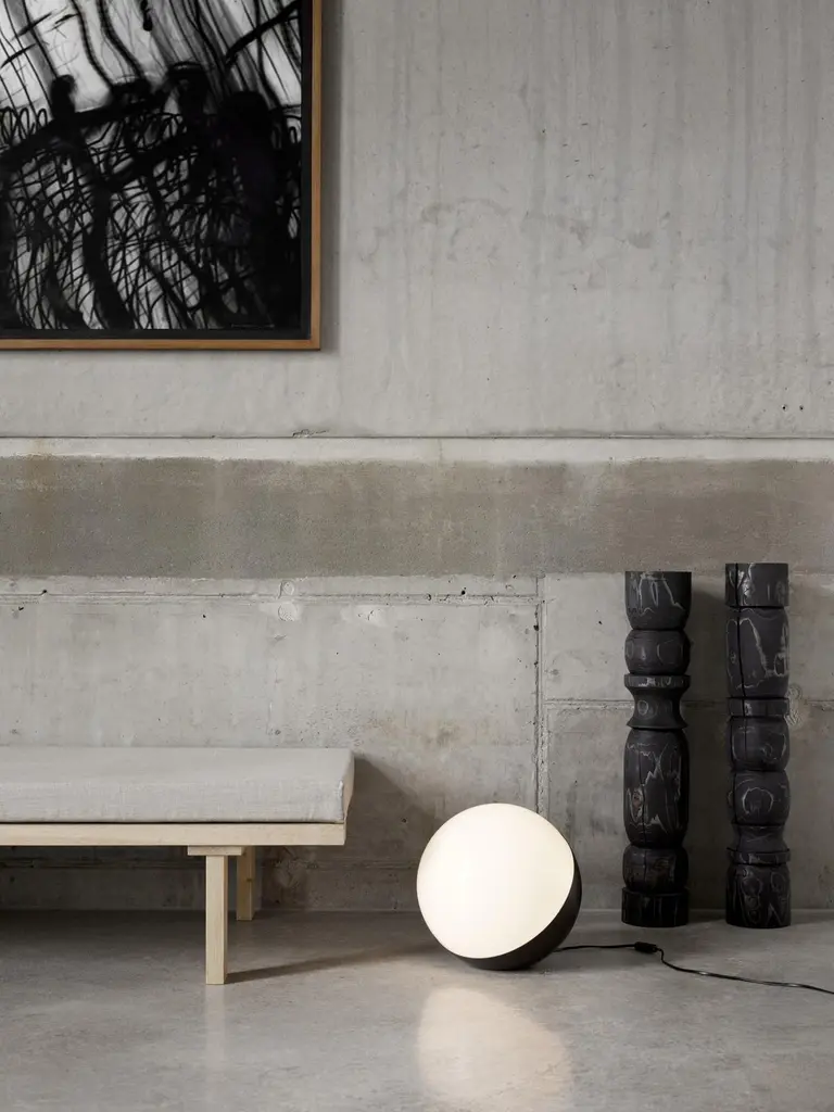 Large Vilhelm Lauritzen 'VL Studio' Metal and Glass Floor Lamp for Louis PoulsenThis innovative lamp is based on Lauritzen's original studio wall lamp for Radiohuset, the headquarters of the Danish Broadcasting Company, which indicated with a red or green light whether the studio was recording. Executed in mouth blown, triple-layered opal glass and deep-drawn aluminum or brass, the 'VL Studio' is an authorized re-edition from Louis Poulsen. It emits a warm, glare-free light with glossy opal glass radiating a pleasant glow to its surroundings. The unique design allows for versatility and lends itself to applications as both a table or a floor lamp. Hand-crafted with careful attention to detail from the highest quality materials in Denmark.Price per item. Available in unlimited quantities in three sizes and in choice of slightly brushed brass or wet painted matte black aluminum frame. Also available as a wall-mounted version in a separate listing. This listing is for the large sized 'VL Studio' table lamp in black painted metal and glass. In-stock lead time 1-3 days. Out of stock lead time can add 8 weeks or more. Please note that inventory availability is subject to change at any time. For time-sensitive orders, please inquire prior to purchasing.Accommodates a single 60W equivalent standard medium base LED bulb. Bulb not included. UL listed. Ships with 8.2' cord in black for black variant or white for brass. On/off switch on cable; electronic dimmer switch (requires dimmable lamp). Made to order.All sales are final.