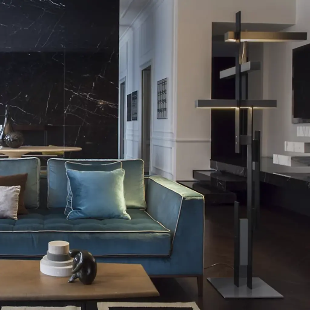 The Oluce Las LED Floor Lamp is an abstract sculptural piece and light source all-in-one. Finished in black, the slender metal arms make an impactful visual with their intersecting structure and sharp angles. Each metal bar houses LED light sources which are shielded with diffusers, creating both indirect and direct light.