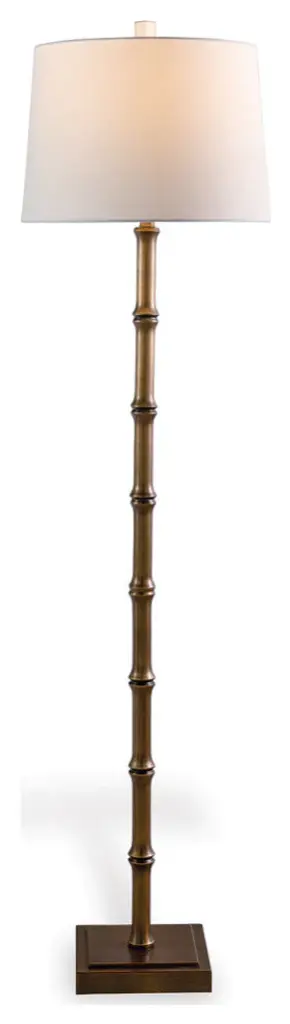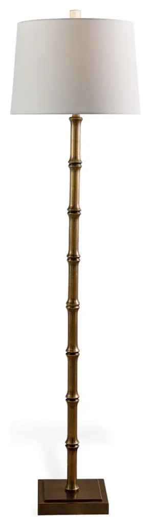 Our Lauderdale floor lamp features metal bamboo turnings with antiqued aged brass finish. Metal finial. 3 way, 150 watt max bulb. Lightbulb not included. Shade: 15" top x 17" bottom x 12"SHHardback shade with soft rolled edge. Brass spider. Materials: steel metal