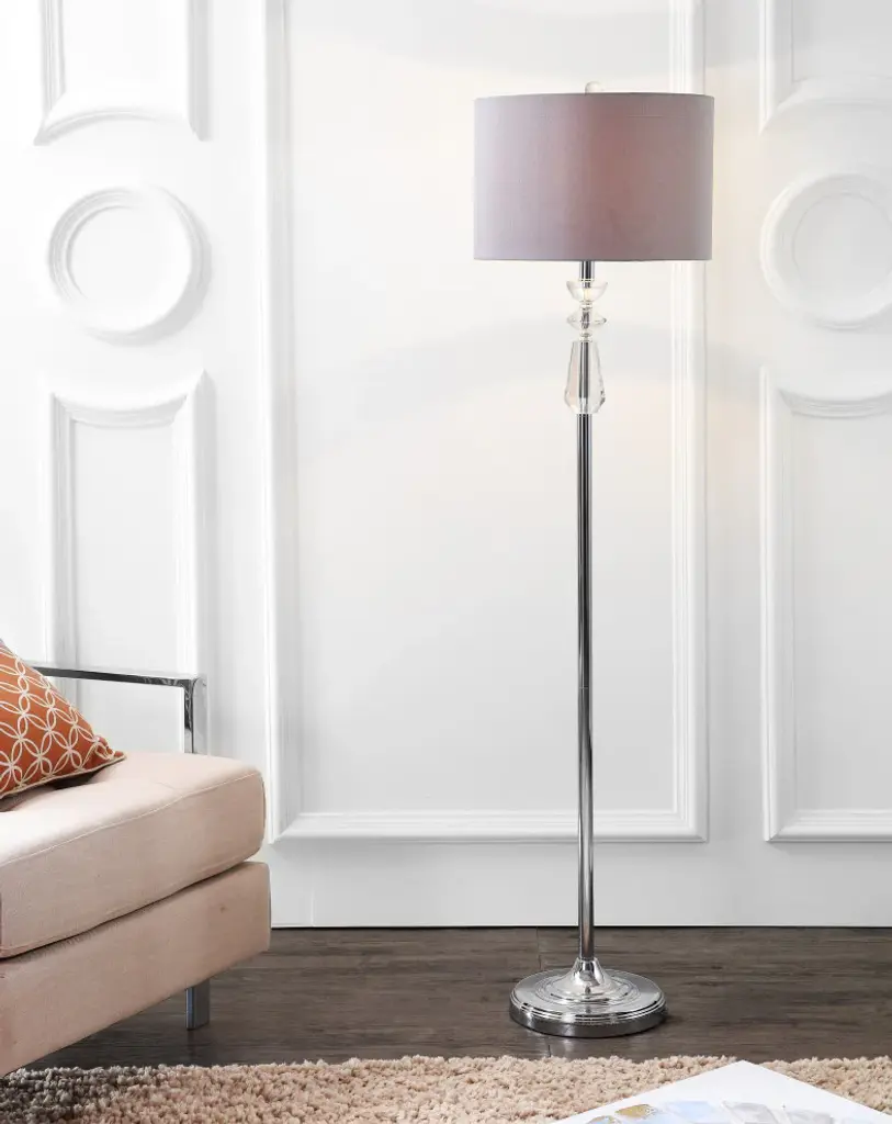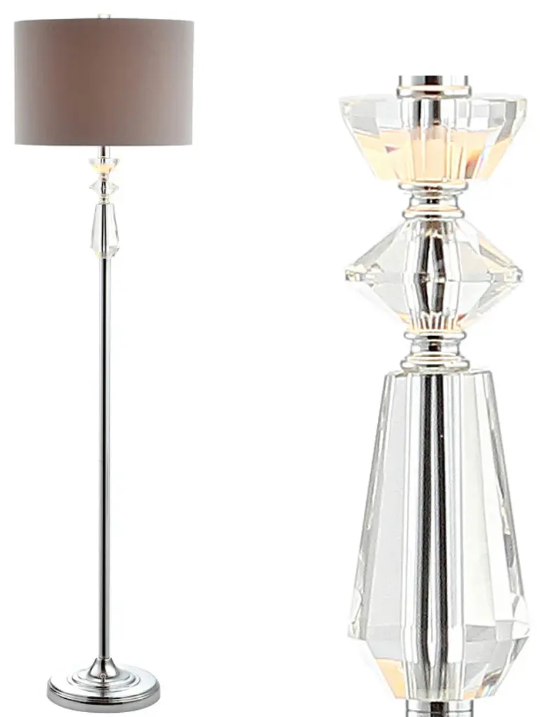 Perfect for rooms with a moody, neutral color scheme in need of a pop of glamour, this floor lamp delivers a lot of style in a classic shape. Accented with a trio of faceted crystal objects at the neck of the base, it is completed with a grey drum shade and chrome body. The crystal finial ties the look together and is seemingly illuminated when the bulb is lit. -Chrome floor lamp with crystal accents accented with a gray shade -100% cotton hardback drum shade in gray-72" silk cord with standard USA 2-prong plug -On-off switch on socket-Takes one maximum 100 watt or equivalent bulb -Eco-friendly 9W LED bulb included-UL Listed-Color: Clear/Chrome with gray shade-Body Material: Crystal / Metal-Base Material: Iron-Finial Material: Crystal-Finial Color: Clear-Harp Color: Silver-Includes: One (1) lamp(s)-Minor Assembly Required-Lamp: 59.5 inches high x 15 inches wide x 15 inches deep-Shade: 10 inches high x 15 inches wide x 15 inches deepAbout us: You see a lamp.We see a decorative work of art.A perfectly curved shade casts a dramatic shadow on a floor. A silk cord you never want to hide. LED lightbulbs: as easy on the environment as they are on the eyes. The JONATHAN Y Lighting collection considers every detail from impeccably sourced materials to designer styling. And our prices are so attractive, we''ve transformed a functional necessity into a fashion accessory.JONATHAN Y Lighting a fashion revolution in home decor.