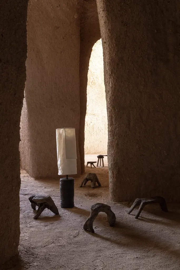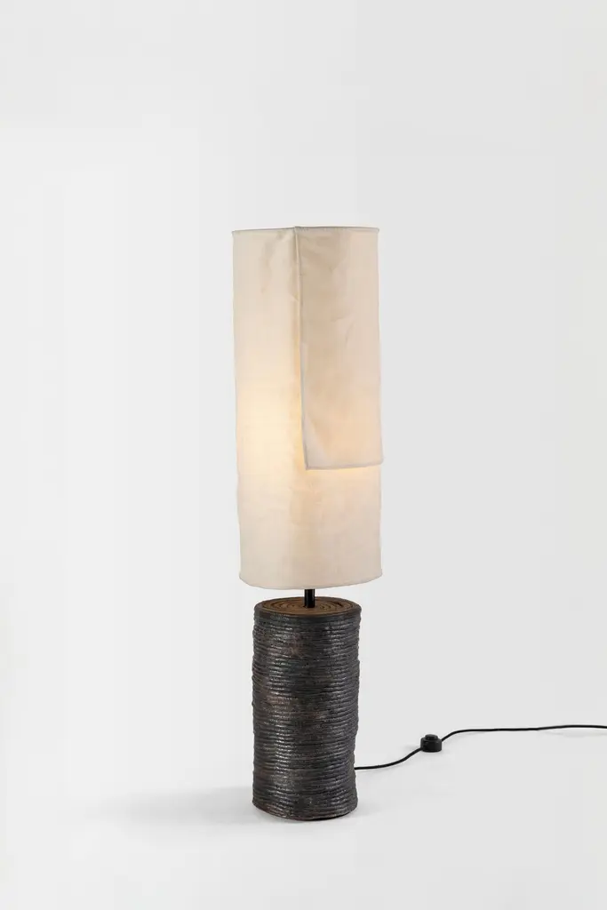 Nuanced craftsmanship shapes the pieces of the Lazo collection. A traditional Japanese wood burning technique emphasizes the grain of the tables’ wood and soft spun fibers give the lamps their subtle texture. The pieces’ bases are the products of hands patiently molding terracotta and coating it with a bronze powder that takes on a unique metallic glow thanks to the temperature of the kiln.