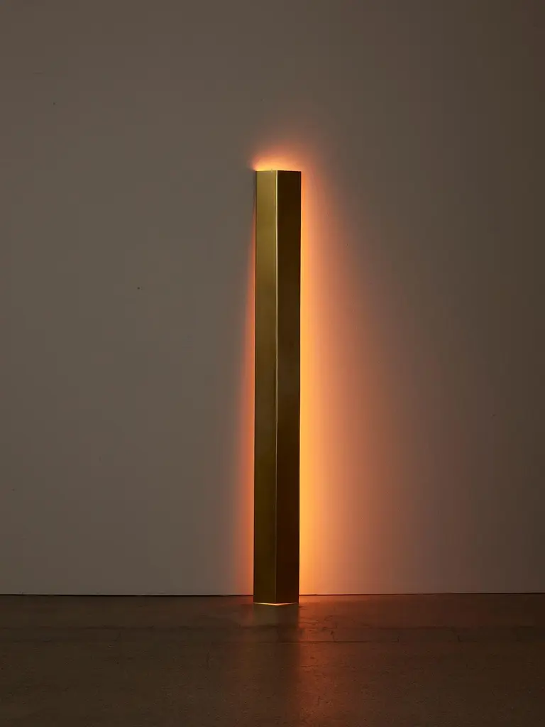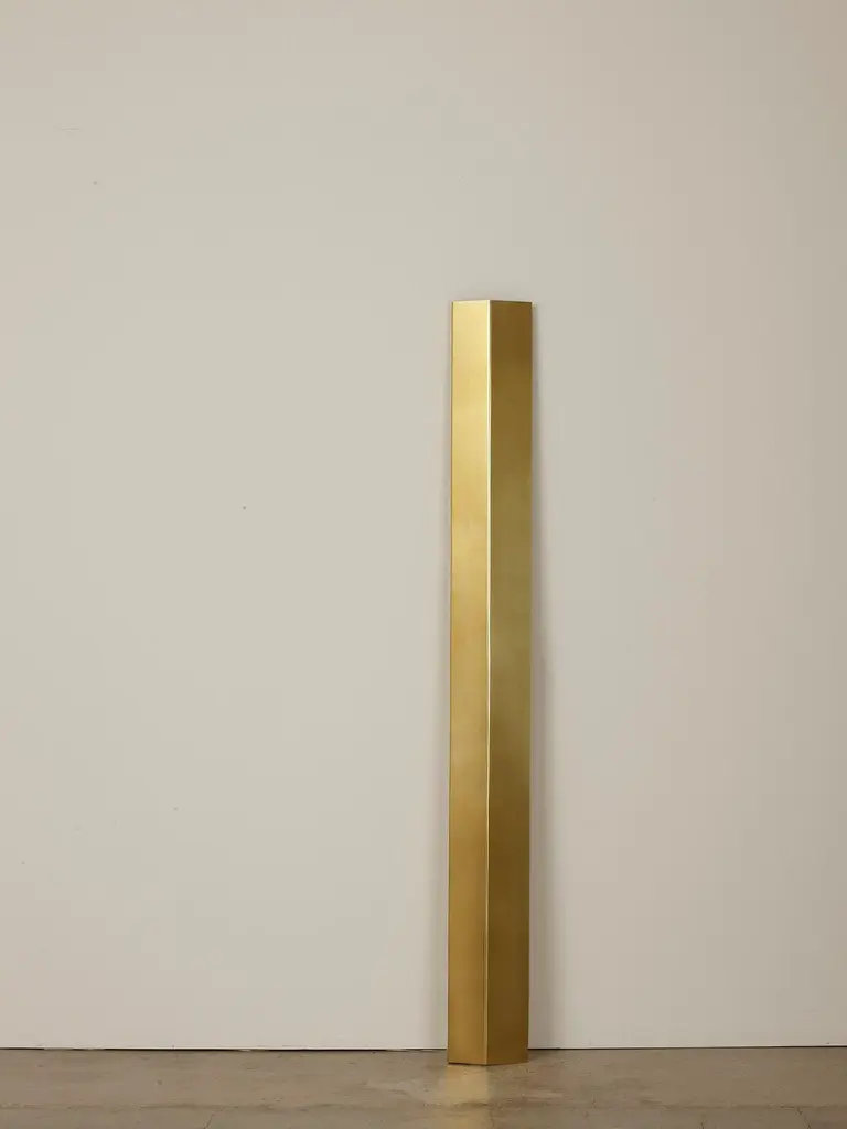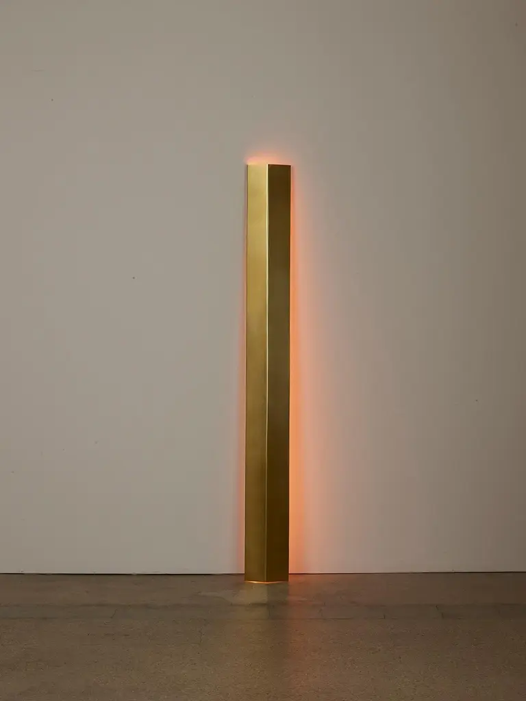 Leaning Mano 6 foot lamp by Umberto Bellardi Ricci.Dimensions: D 7"x W 3" x H 72 in.Materials: Brass, Led strip, 24V Driver, Remote Dimmer.All our lamps can be wired according to each country. If sold to the USA it will be wired for the USA for instance.Umberto Bellardi Ricci is an Italian sculptor and architect based in New York City, practicing across London, Mexico, and New York. His work revolves around the interplay of art and design while exploring the spatial aspects of sculpture and social sciences through the medium of architecture. Umberto initially started with geometric abstraction largely interpreted in cast concrete, influenced by his Japanese mentor and Mexican modernism, as he founded an acclaimed sculptural project in Las Pozas, the surrealist garden in central Mexico. Since he relocated to New York, he has been focusing on a series of folded steel and brass sculptures, that often incorporate reflective light sources. While he still works with abstract compositions, pairing ready-made materials with crafted wood and rubber details, his latest furniture pieces explore the dialogue between contrasting raw construction elements, such as I-beams or concrete blocks, and refined textures like marble and glass. Having taught architecture for many years at the Architectural Association in London and at the Cornell University in New York, he designed the home for Turner Price laureate Laure Prouvost in Hackney, and has recently been commissioned to make objects and furniture for Jenna Lyons’ studio in Soho.