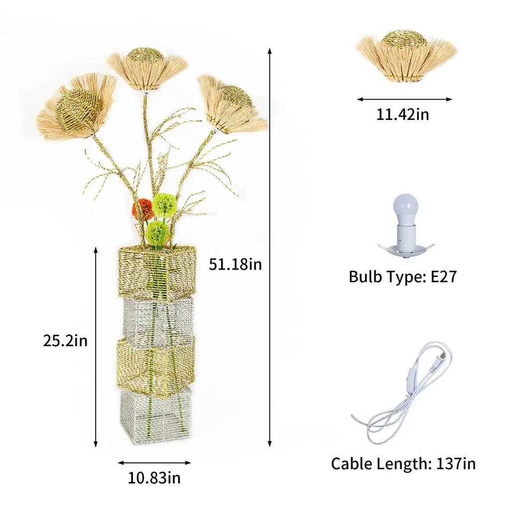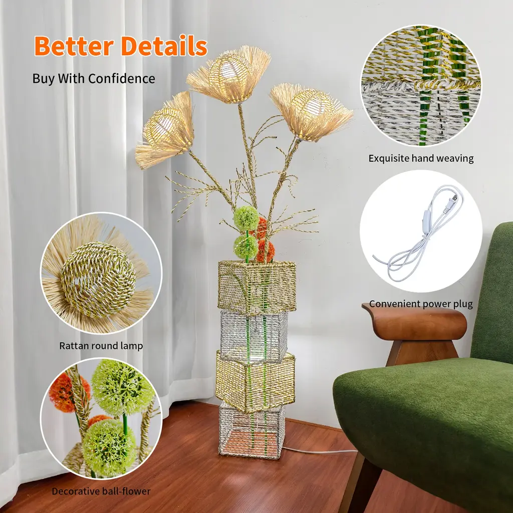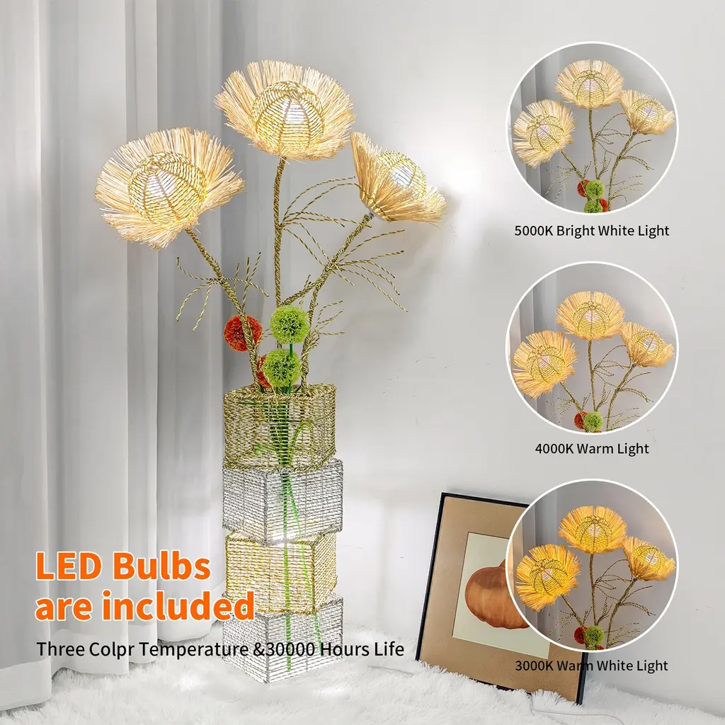 Rattan weaving floor lamp which is beautiful decorative,standing light bulb floor lights with handmade tree lanterns artificial dandelion flowers, very aesthetic compatible with most furniture decorations.Weaving rattan cover so the light is soft and no dazzling, it will not cause eye strain.4 Pack led bulb casts a glow of glamorous illumination, features three adjustable lighting colors from warm light, to natural light, to cold light to suit your activities and mood,It can serve you for years. Modern floor lamp place it to your home, living room, bedroom, sofa side, study,balcony, etc,can add a gorgeous and elegant romantic atmosphere to your home environment.Features:Specifications:Package Includes: