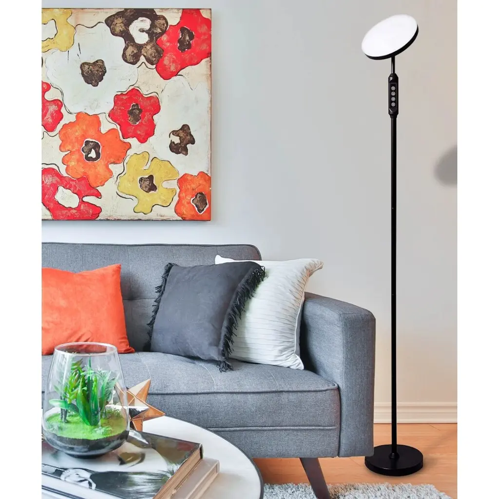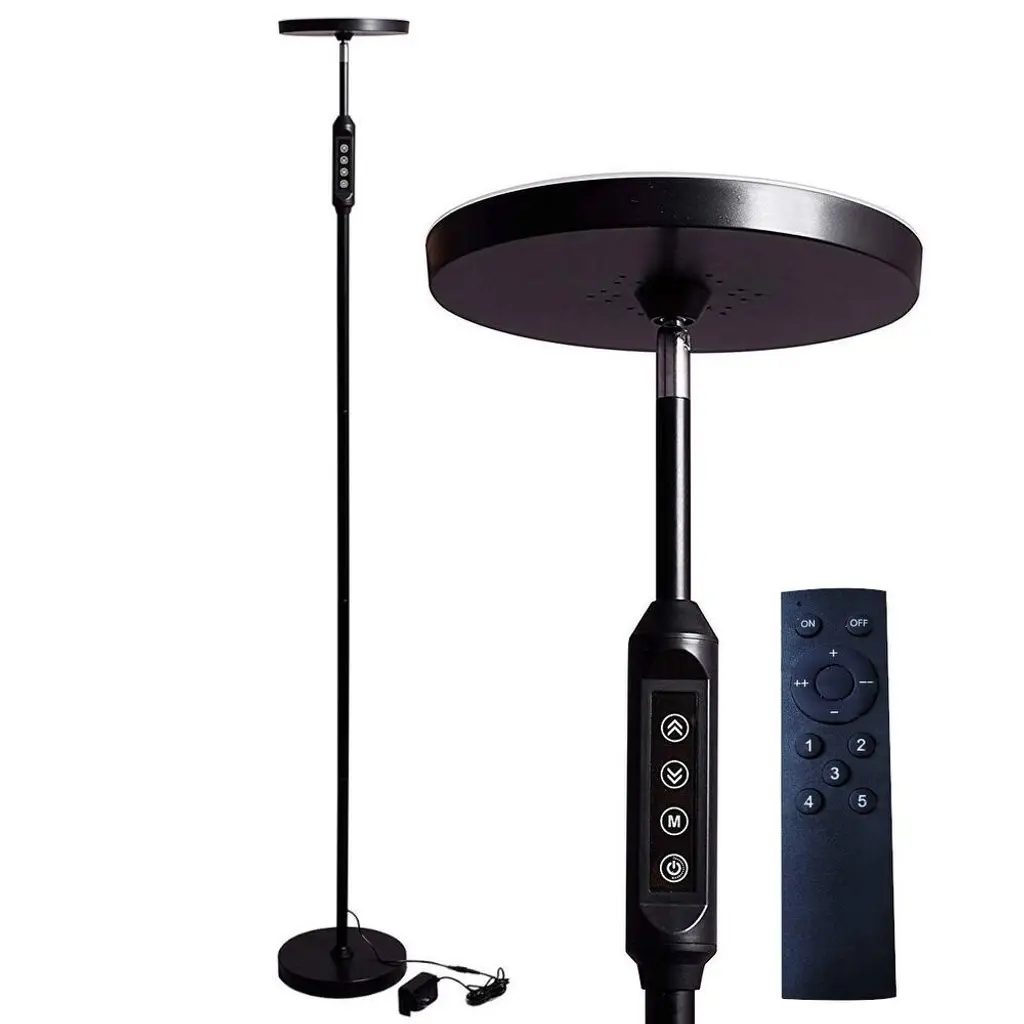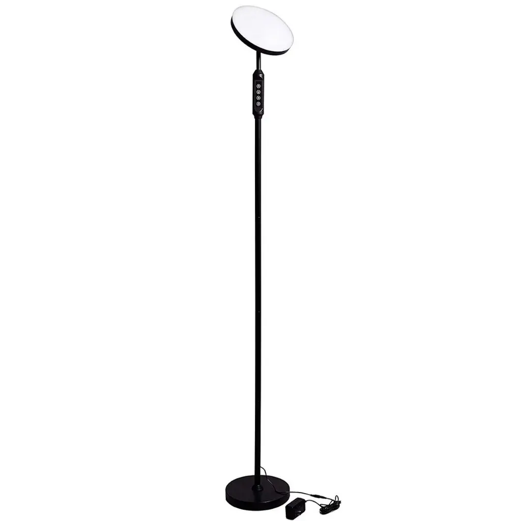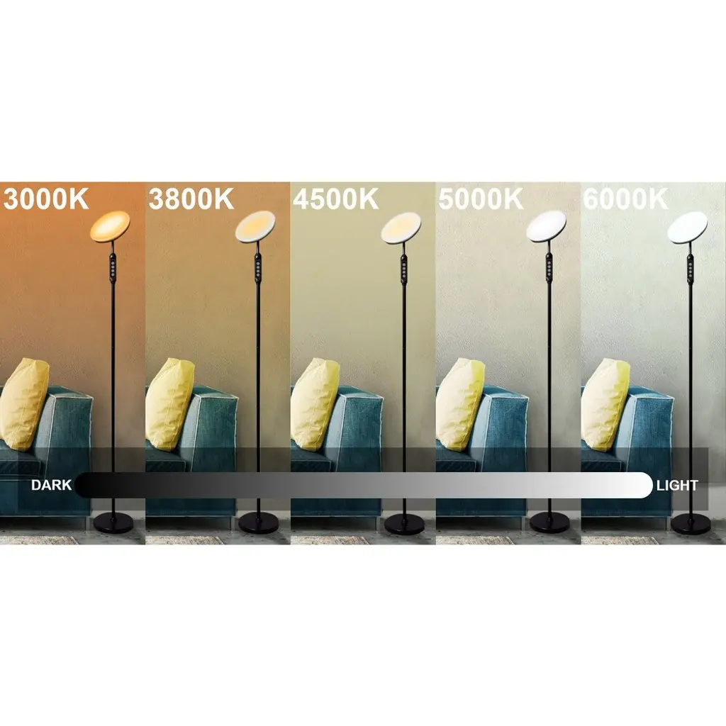 SUPER BRIGHT LED FLOOR LampLight up your entire room with the Super-Bright LED Torch Floor Lamp. High powered Light Emitting Diodes lights deliver 2,100 lumens bathes your room in light, allowing your eyes to see better. Intelligent Design Features make this the ultimate Torchiere Floor lamp. Instant-on, flicker-free LED light reduces eye strain and the fatigue you used to get from old fluorescent bulbs. 5 Color settings lets you control the light from 3000K Amber to 6000K natural daylight . A soft white diffuser prevents sharp glare and our thoughtful multifunction switch on the neck lets you adjust the light for any environment. Plus you get a remote to control the light from across the room!Sturdy weighted base and Adjustable Head Heavy 7 lb. base keeps your lamp upright so pets and kids won't knock it over. 350 degree Adjustable Floor Lamp head lets you position the light exactly where you need it.Energy Saving Floor Lamp The Super Bright LED lamp is rated at 50,000 hours, so your new lamp will last 20 years, so you NEVER have to worry about replacing bulbs or re-wiring a ballast (and since it only uses 24 watts of electricity, will save you $100's on your electric bill.)Dimmable LightThe Super Bright lamp has 5 levels of dimming and 5 color settings so you can customize the perfect light for your mood. Control from the neck or the handy remote control (included). Please compare features, lumens, CRI, Wattage, price and ***** happy customers. We think you will agree that Super Bright Torchiere is your best LED floor lamp choice.