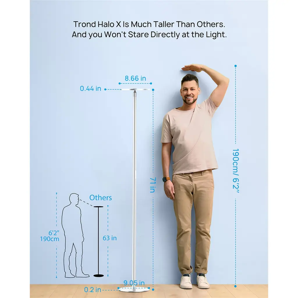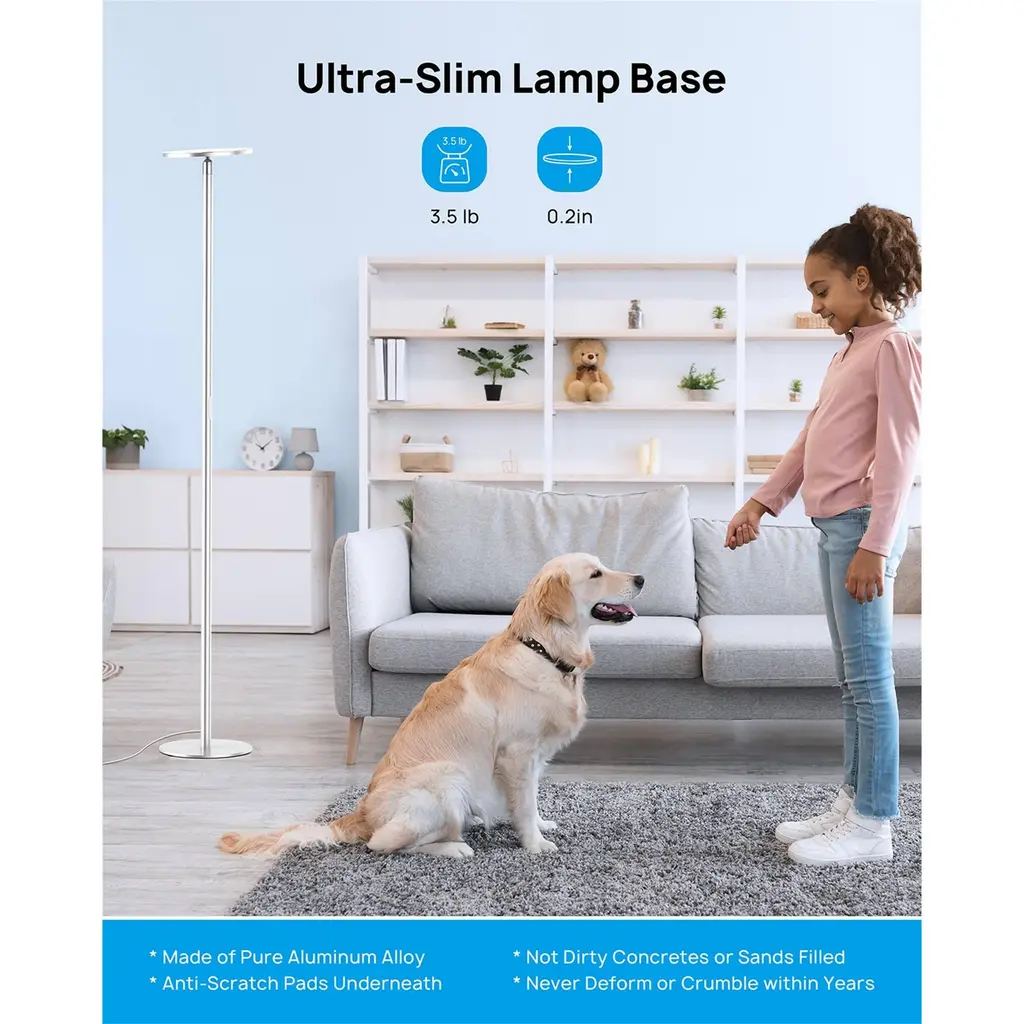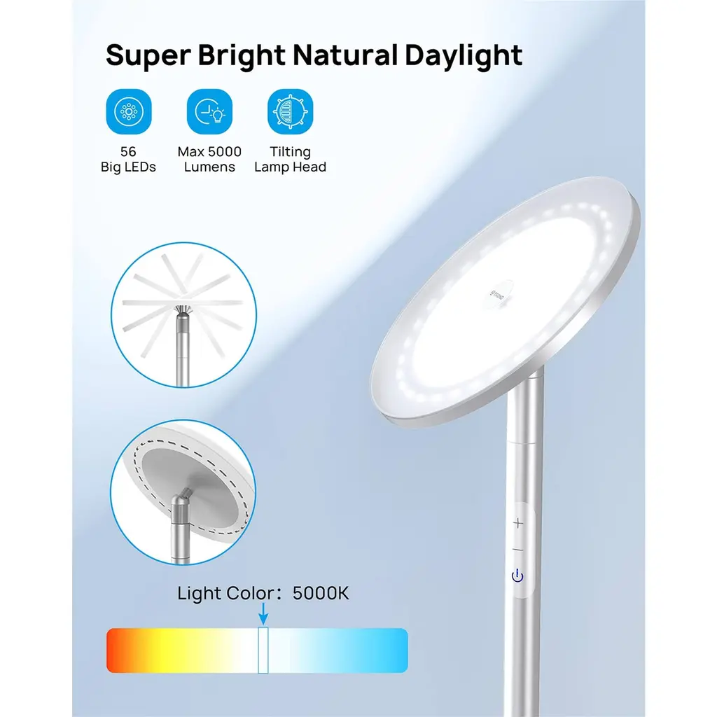 Bright Floor Lamp: The led floor lamp upgraded 56 highly efficient 3030 LEDs with the max. 30W power consumption, this LED sky torchiere floor lamp can emit sufficient natural light (5500 K) to light up your 15 x 20 living room, bedroom, or office. The lamp head easily pivots and shines light in any direction that you need it Modern Floor Lamp: This floor lamp innovatively features 4 detachable modular aluminum rods, all of which have the integrated power cords built inside. This design gives you the convenience and flexibility to assemble, disassemble and adjust the height. The tall floor lamp total height is 71 in, taller than other similar lamps, so that you won’t stare directly at the bright light 5 Level Dimmable and Memory Function: This dimmable floor lamp features 5 brightness levels and sensitive touch control, provides a high illumination from 630 lm to max. 5000 lm. The corner floor lamp can turn on back to the previous brightness setting from your last use. If the power cut off, it can auto turn on and get lit up at the last brightness setting. Long press the on/off switch for 2 seconds to activate the 30-minute light timer walk upstairs safely without manually turning off the light
