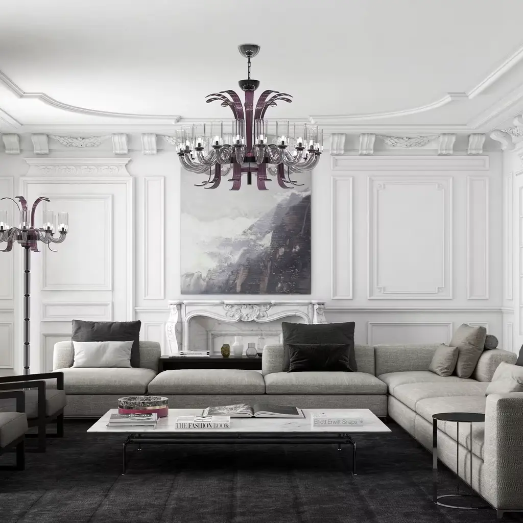 This Modern 10-Light Floor Lamp is entirely handmade in our furnace in Murano Island by master glassmakers according to ancient and secret traditions handed down from father to son since 1300. For centuries, Murano glass has been the most famous glass in the world and one of the most desired Made in Italy products for furnishing luxury environments. For centuries, Murano glass has been the most famous glass in the world and one of the most desired Made in Italy products for furnishing luxury environments. Since the dawn of time, Murano glass chandeliers and furnishing objects have decorated the most prestigious homes and have given an unmistakable light to any room. Any of our Murano Glass lighting fixtures is always unique and unrepeatable, the result of artisan tradition and advanced industrial techniques. For this reason its origin is certified by the Trademark of the Italian law “Vetro Artistico® Murano”. GLASS COLOR: Purple and Gray, METAL FINISHING: Chrome, CUSTOMIZATION: Customizable in glass colors, metal finishings.