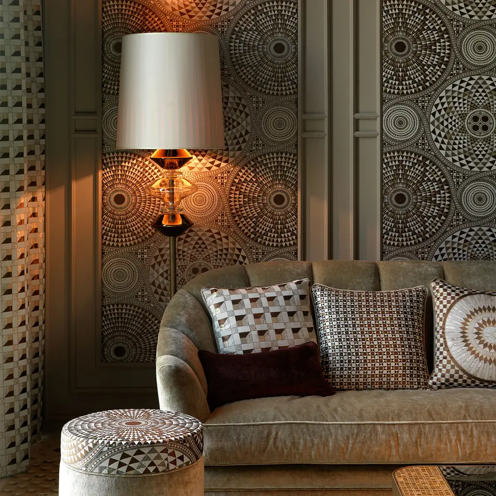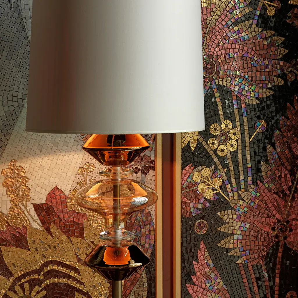 Designed by Massimiliano Raggi and part of the Lescot Collection, this floor lamp features a traditional silhouette interpreted with modern sensibility and creating a timeless and intriguing piece. The metal structure with a bronze finish boasts inserts in bronzed or chromed borosilicate glass and a fabric shade internally lined with bronzed or silver color. The bulb is an E27 60Max and the 220 voltage can be changed upon request. For customization, please ask the Concierge. This piece has a CE certification.