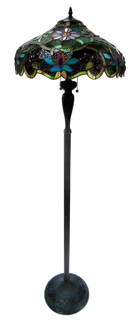 LESLIE, a Victorian downward floor lamp, will make a design statement by itself. Expand the effect by adding one or more of the other lamps in this design style. Expertly handcrafted with top quality materials including real stained glass and gem-like cabochons. The resin base and metal pole are finished in an antique bronze patina.(2) 100 Watt max E26 Type A Bulb (not included)Pull chain switch530pcs glass cut, 80 beadsDownlightIndoor SettingSince these are hand crafted products, the exact color of glass pieces may vary. Colors of the glass will appear darker and less vibrant when not illuminated. Handmade glass will vary from one piece to the other; glass made at different times will also vary. Light bulbs used in lamps or ambient lighting may affect the appearance of the products. Stained glass product has been protected with mineral oil as part of the finishing process. Please use a soft dry cloth to remove any excess oil.