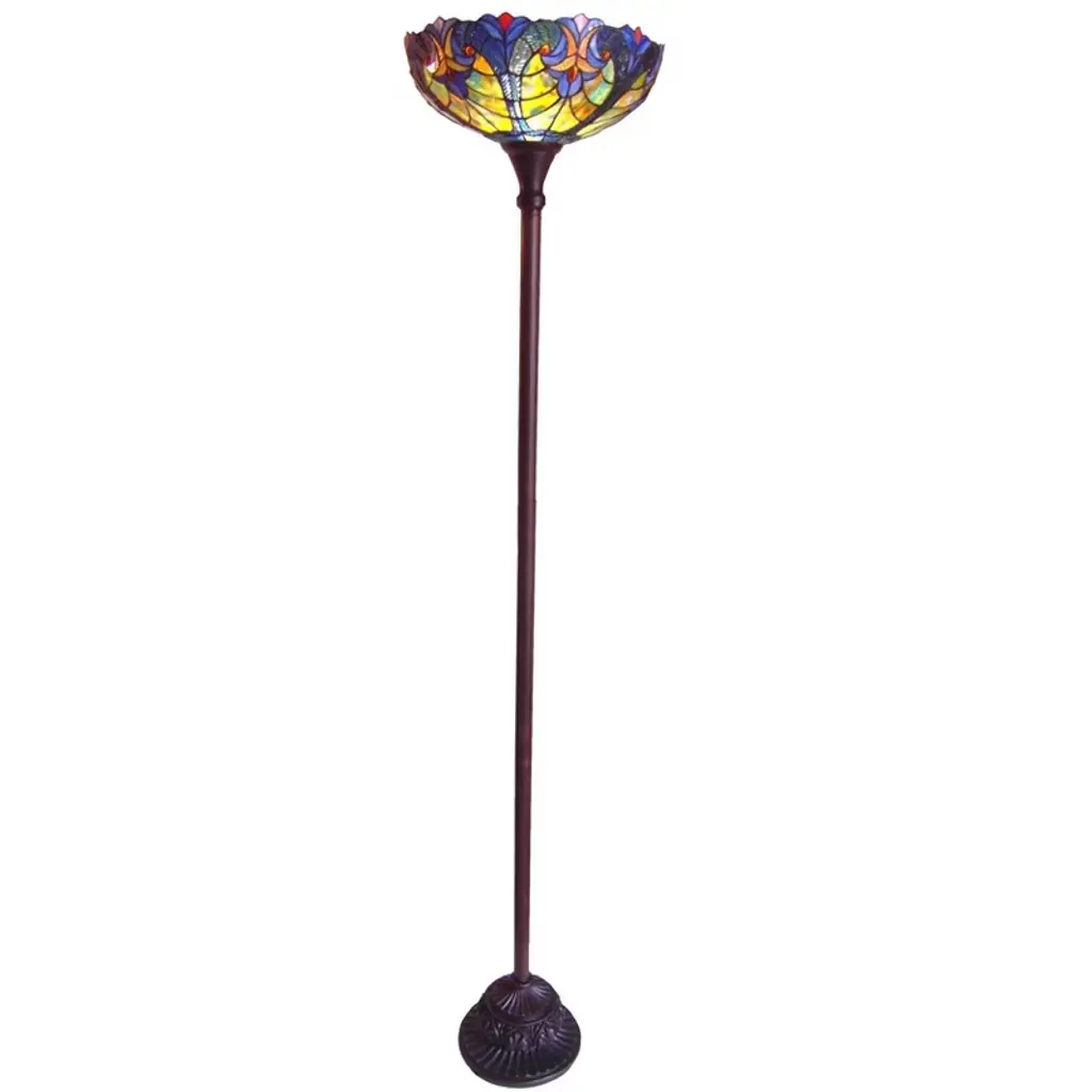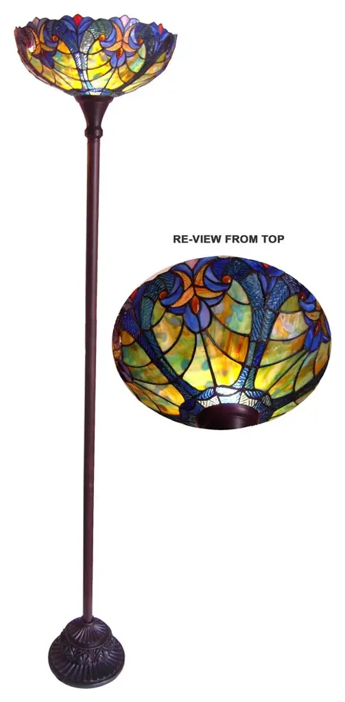 Illuminate your living spaces in classic style with the blue Victorian Tiffany style torchiere floor lamp. With the beauty of Tiffany style glass, this piece glows in dominant blue. The glass is accented with matching cabochons completing the vintage look. (1) 60 Watt max E26 Type A Bulb (not included) On-cord foot-stepper switch306pcs glass cut, 18 cabochonsUplightIndoor SettingHarmonized code: 940520Since these are hand crafted products, the exact color of glass pieces may vary. Colors of the glass will appear darker and less vibrant when not illuminated. Handmade glass will vary from one piece to the other; glass made at different times will also vary. Light bulbs used in lamps or ambient lighting may affect the appearance of the products. Stained glass product has been protected with mineral oil as part of the finishing process. Please use a soft dry cloth to remove any excess oil.