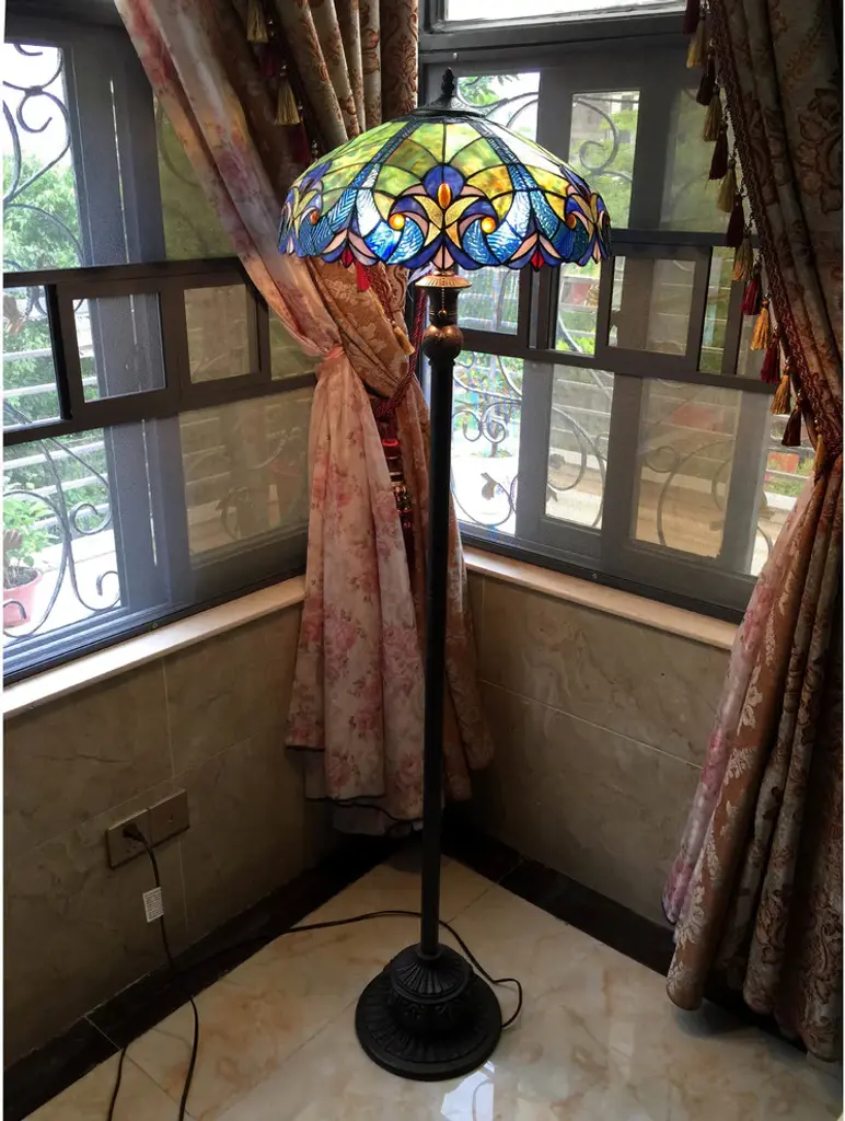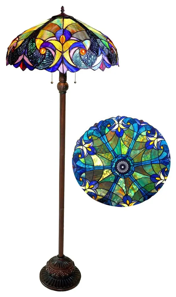 This Tiffany style Victorian design floor lamp with bronze finished base will compliment many decors throughout the home and provide years of satisfaction. Shades of green, blue, amber and red.(2) 100 Watt max E26 Type A Bulb (not included) Pull chain switch306pcs glass cut, 18 beadsDownlightIndoor SettingSince these are hand crafted products, the exact color of glass pieces may vary. Colors of the glass will appear darker and less vibrant when not illuminated. Handmade glass will vary from one piece to the other; glass made at different times will also vary. Light bulbs used in lamps or ambient lighting may affect the appearance of the products. Stained glass product has been protected with mineral oil as part of the finishing process. Please use a soft dry cloth to remove any excess oil.