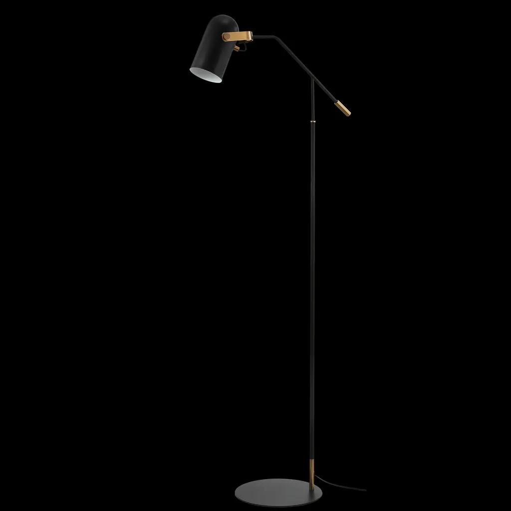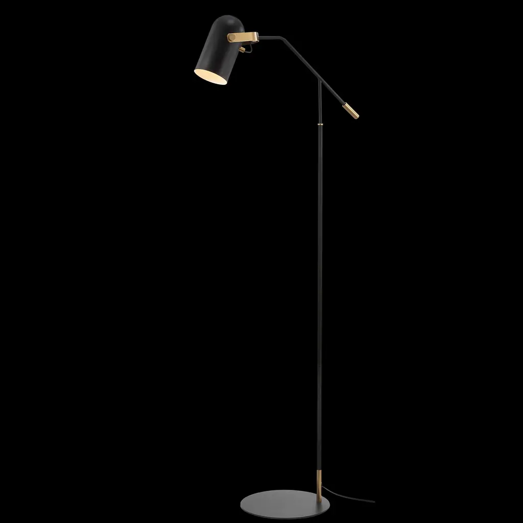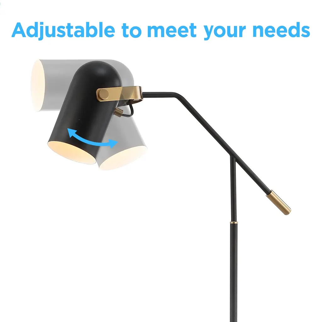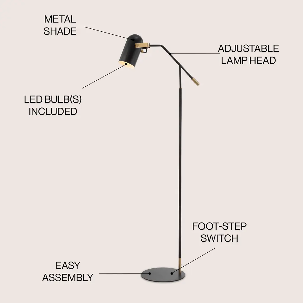 With a levered arm to allow for adjustments to the perfect angle, this task-style floor lamp is a great addition to contemporary or midcentury décor. In matte black with brass fittings, the shape of the metal shade evokes a vintage spotlight -- a fitting tribute for a stage-stealing style. With a sleek base that easily slides under a sofa or chair, you'll be able to pull this piece up close for maximum reading light. Features:Dimensions:About us:You see a lamp.We see a decorative work of art.A perfectly curved shade casts a dramatic shadow on a floor. A silk cord you never want to hide. LED lightbulbs: as easy on the environment as they are on the eyes. The JONATHAN Y Lighting collection considers every detail from impeccably sourced materials to designer styling. And our prices are so attractive, we've transformed a functional necessity into a fashion accessory.JONATHAN Y Lighting - a fashion revolution in home decor.
