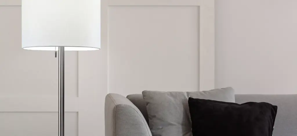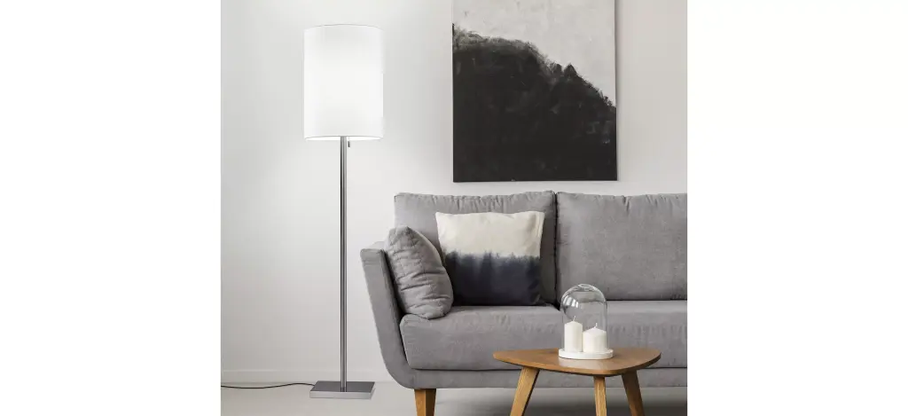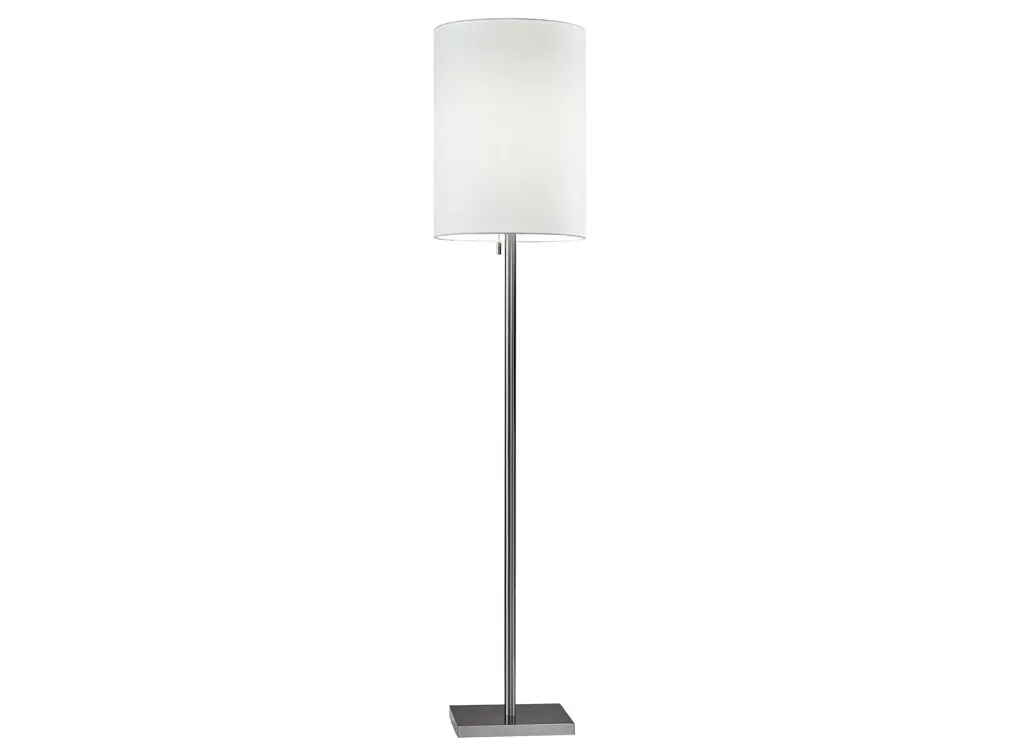 The Liam Floor Lamp is an elegant style that highlights simple materials and a classic silhouette. A thick brushed steel metal pole supports a white textured fabric shade. A tall cylinder shade is contrasted by a compact square shaped metal base. A simple pull chain turns the lamp on and off. A subtle clear cord trails out from the base. Place this floor lamp in your living room for a soft, modern look.