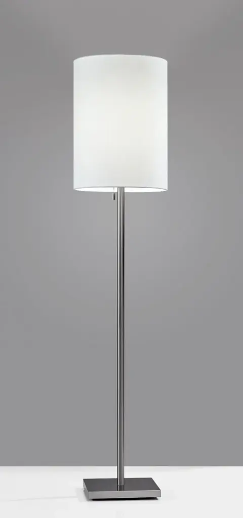 The Liam Floor Lamp is an elegant style that highlights simple materials and a classic silhouette. A thick brushed steel metal pole supports a white textured fabric shade. A tall cylinder shade is contrasted by a compact square shaped metal base. A simple pull chain turns the lamp on and off. A subtle clear cord trails out from the base. Place this floor lamp in your living room for a soft, modern look.