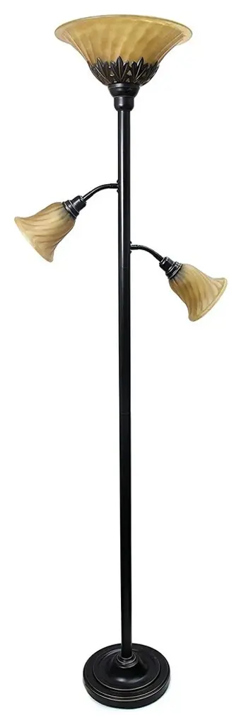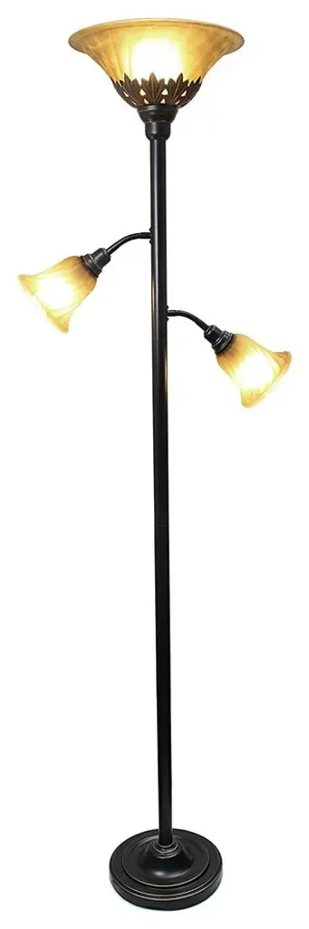 Light up your bedroom, office, foyer or living room with this elegant yet affordable 3 light floor lamp. It features a stunning Restoration Bronze finish and marbelized Champagne shades with spiraled cut glass to complete the timeless look.Color:Restoration Bronze. Measures: 13 x 21.5 x 71 inches. Restoration Bronze finish. Champagne scalloped glass shades. Main light uses: 1 x 100W medium base Type a bulb (not included) reading lights use: 2 x 60W Type a medium base bulbs (not included).Dimensions; L: 13 inch x w: 21.5 inch x H: 71 inch. Some assembly required- Restoration Bronze finish- Champagne scalloped glass shades- Main light uses: 1 x 100W medium base Type a bulb (not included) reading lights use: 2 x 60 W Type a medium base bulbs (not included)- Dimensions; L: 13 inch x w: 21.5 inch x H: 71 inch- Some assembly required