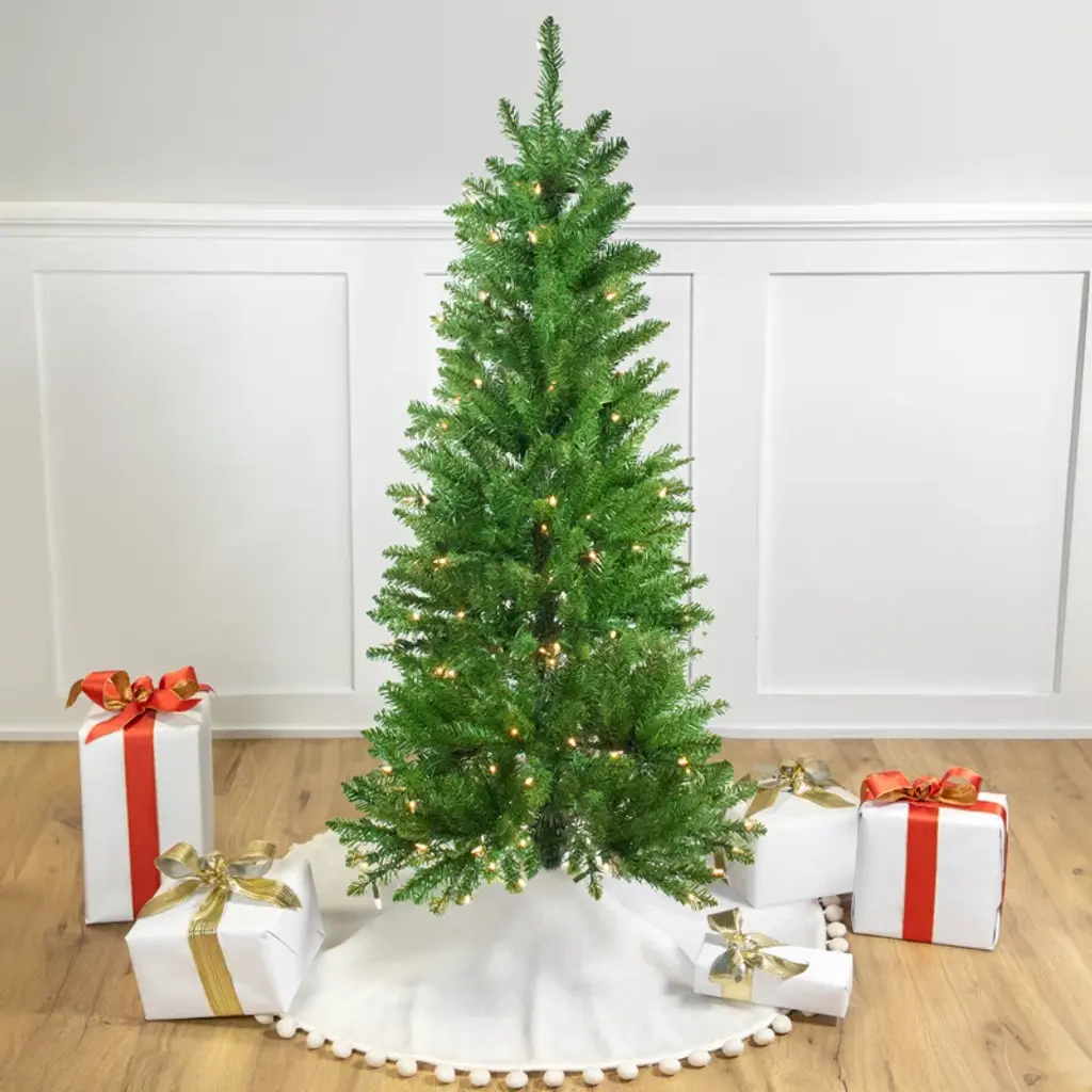 This elegant artificial Christmas tree is based on the beautiful White River Fir. This modest 4.5-foot tree features a slim frame and comes pre-lit with clear incandescent lights. An abundance of life-like tree tips give a lush and full appearance while still maintaining a slender profile. Let this White River Fir light up your holiday decor for years to come. Product Features: Pre-lit with 150 clear lights. Bulb size: mini. 347 tips. 1.5" wide tapered tips. 36" green lead cord. Additional Product Features: Pencil profile tree. Hinged branch construction. Light sets on tree are UL listed for indoor or outdoor use however the tree itself is recommended for indoor use only. If one bulb burns out the rest will stay lit. Lights are equipped with Lamp Lock feature which makes them replaceable interchangeable and keeps them from falling out. 3-piece easy assembly (including stand). Comes with replacement bulbs and spare fuses. Comes with a FREE green metal tree stand. Wire gauge: 22. 120 volts 60 hertz .34 amps 40.8 watts. Dimensions: 4.5' high (from the base of the stand to the top of the tree). Distance from floor to the first row of branches: 10". 24" base diameter (at the widest point). Material(s): PVC/metal/glass bulbs/wire. Note: Branches are compressed for shipment and need to be fluffed out upon arrival to look like the photo.