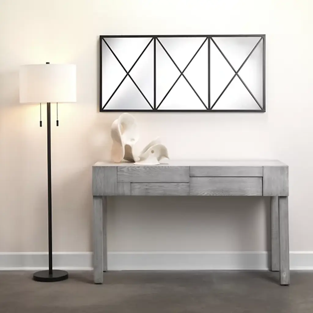 Create a minimalistic look for your home with the Lincoln Floor Lamp by Jamie Young Co. A metal baseplate is the platform from which a slender rod extends. This rod is crowned by an intricate shade of white linen. The eye is drawn to the chain switches that stem from the shade in the style of fine jewelry. From within the shade, a Halogen Bulb emits bright light throughout your contemporary setting.