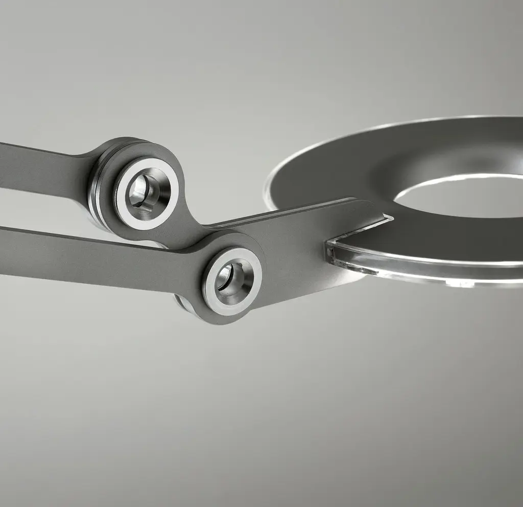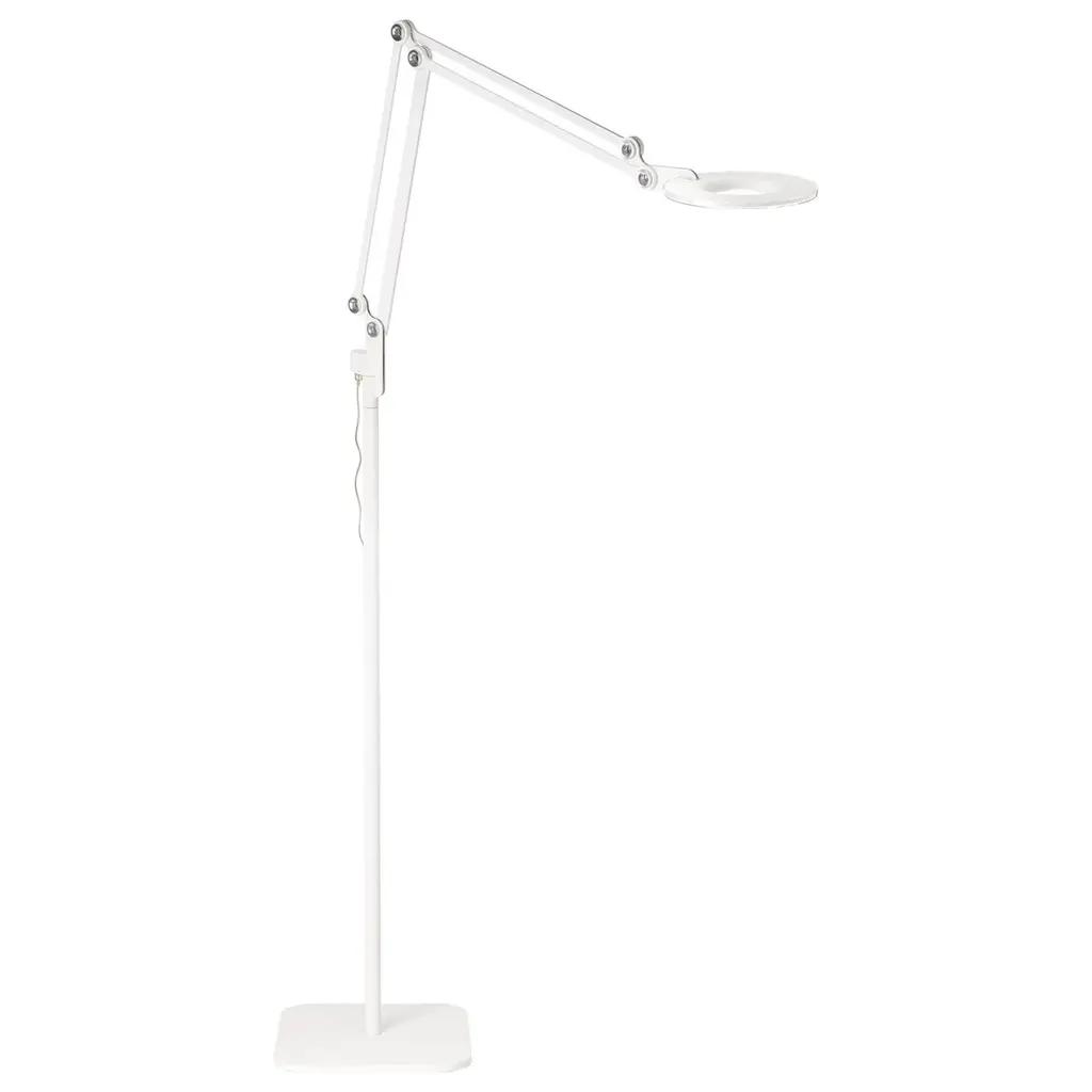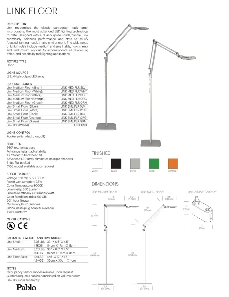 Link modernizes the classic pantograph task lamp, incorporating the most advanced LED lighting technology to date. Designed with a dual-purpose shade/handle, Link seamlessly balances performance and style to satisfy focused lighting needs in any environment. The wide range of Link models includes medium floor lamp to accommodate all residential, office, and hospitality task lighting applications.Features:360° rotation at baseFull-range height adjustability180° front to back head tiltAdvanced LED array eliminates multiple shadowsShips flat-packedOCC model available upon requestSpecifications:Voltage: 120-240V 50-60HzPower consumption: 7.5WColor temperature: 3000KLuminosity: 350 LumensLuminaire efficacy: 47 Lumens/WattColor rendition index: 90 CRI50K hour lifespanCable length: 8’ (244cm)Light source: (99x) High-output LED arrayLight control: Rocker switch (high, low, off)Global multi-plug adapter available1 year warrantyMaterials:Aluminum body, polycarbonate lens, floor base- steel base with aluminum stem.