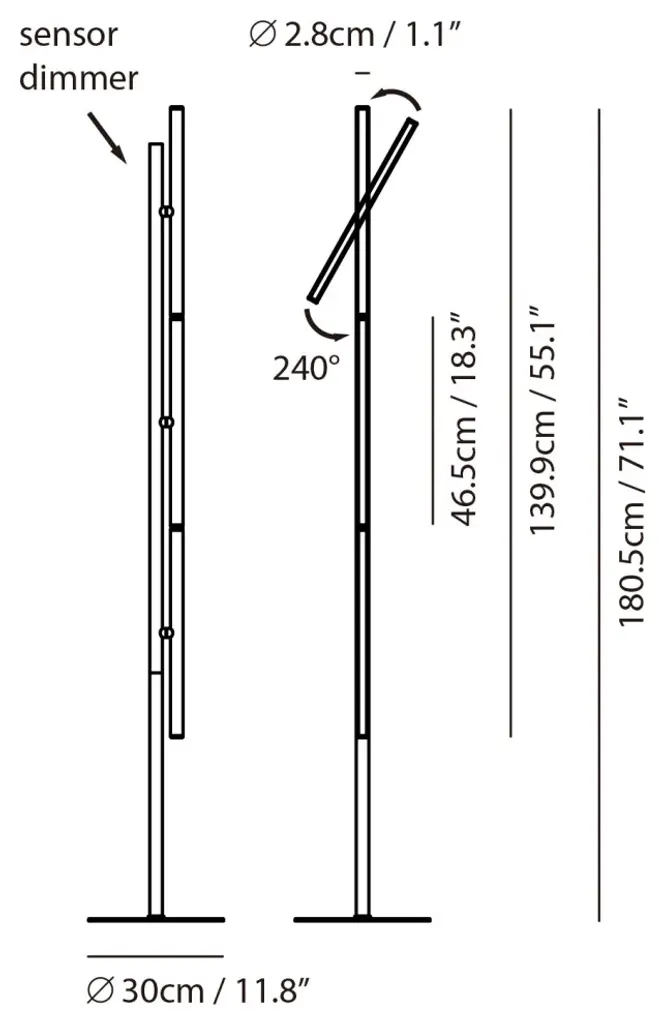 Cutting out all superfluous details, the LISA perfectly depicts the flow of light, thru its highly functional, yet precisely sculptural form. Available in ceiling, wall, and floor lamp configurations, all LISA models offer a high quality CRI95 light output, without undesirable glare. The Wall and Ceiling version are fully dimmable via Triac dimming, while the Floor version is controlled thru a touchless integrated optic sensor. Each LISA lighting beam is adjustable up to 240 degrees for the ceiling and floor model, and up to 300 degrees for the wall version. Whether it is the all shiny black version, or the shiny black with chrome accents, the LISA will serve as an elegant addition to any environment.Light Source: LED 3 x 7W 2700K 706lm CRI98Feature: optic sensor dimmer