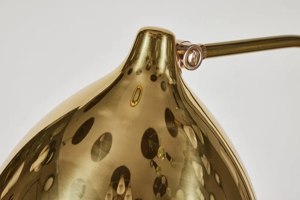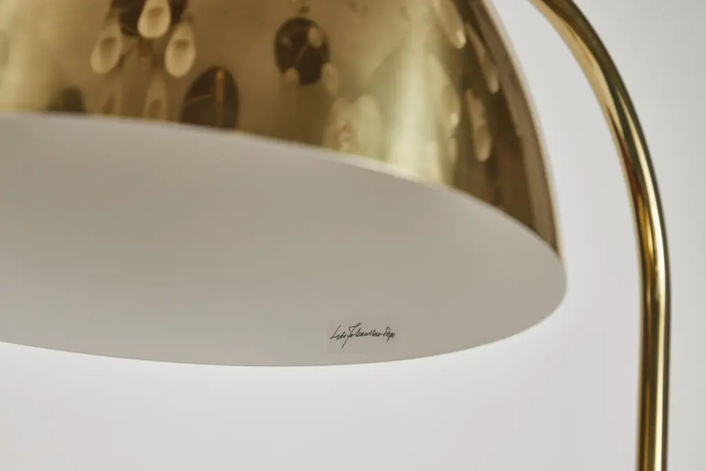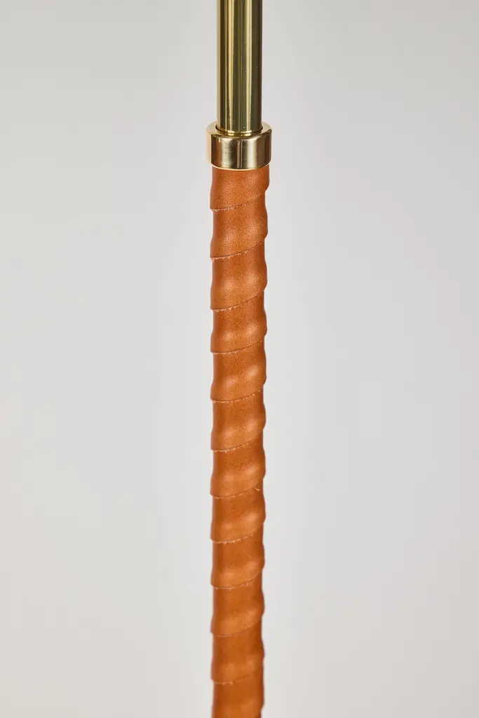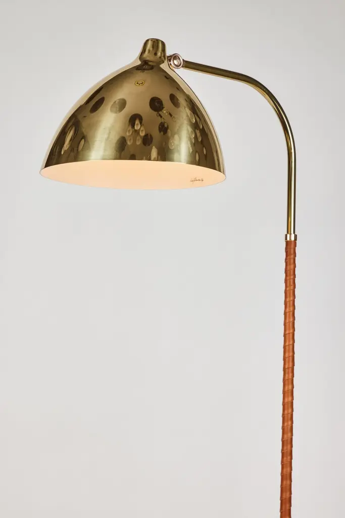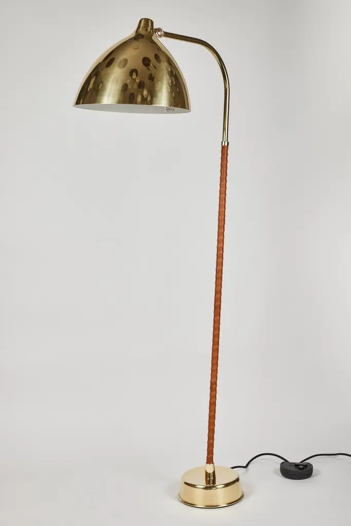 Lisa Johansson-Pape 'Lisa' floor lamp for Innolux Oy.Originally produced in the 1950s by Orno, this newly authorized re-edition of the iconic lamp is made by Innolux in Finland using many of the same small-scale manufacturing techniques, scrupulous attention to detail, materials, and craftsmanship as the original.Executed in polished brass and cognac hand-wrapped leather.Price is per item. Available in unlimited quantities. Six lamps in stock and ready to ship. Out of stock lead time 4-6 weeks or more. Please note in-stock availability subject to change; contact dealer for more information.Accommodates a single standard medium base 75W equivalent LED. Professionally modified with a US plug and foot switch on cord.Not UL listed, but recommended UL listing possible from authorized 3rd party vendor upon request for an additional fee. Please contact the dealer to facilitate.Made to order.All sales final.