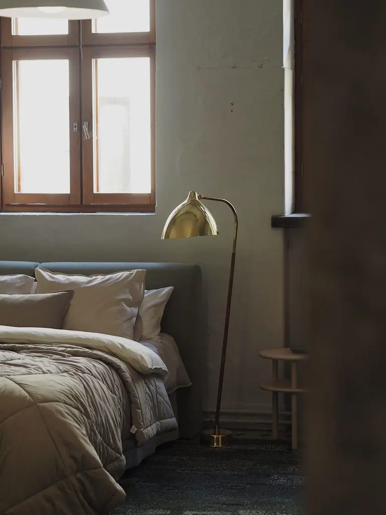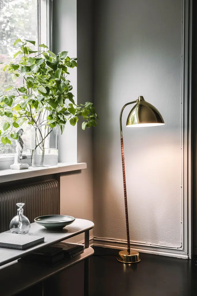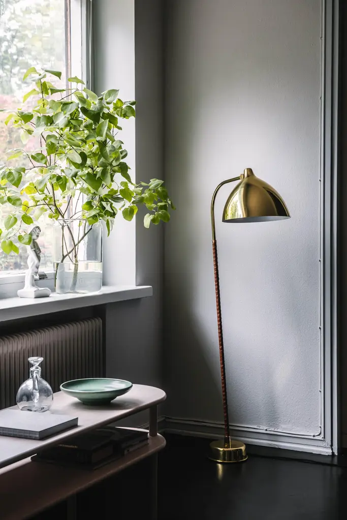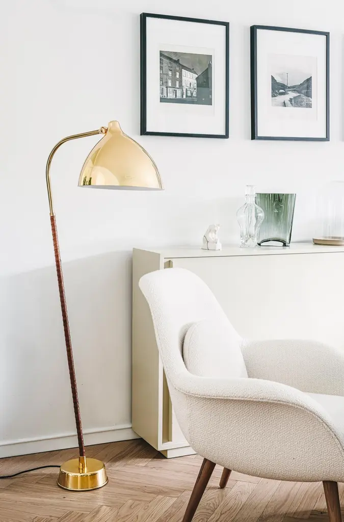 Lisa Johansson-Pape 'Lisa' floor lamp for Innolux Oy.Originally produced in the 1950s by Orno, this newly authorized re-edition of the iconic lamp is made by Innolux in Finland using many of the same small-scale manufacturing techniques, scrupulous attention to detail, materials, and craftsmanship as the original.Executed in polished brass and cognac hand-wrapped leather.Price is per item. Available in unlimited quantities. Six lamps in stock and ready to ship. Out of stock lead time 4-6 weeks or more. Please note in-stock availability subject to change; contact dealer for more information.Accommodates a single standard medium base 75W equivalent LED. Professionally modified with a US plug and foot switch on cord.Not UL listed, but recommended UL listing possible from authorized 3rd party vendor upon request for an additional fee. Please contact the dealer to facilitate.Made to order.All sales final.