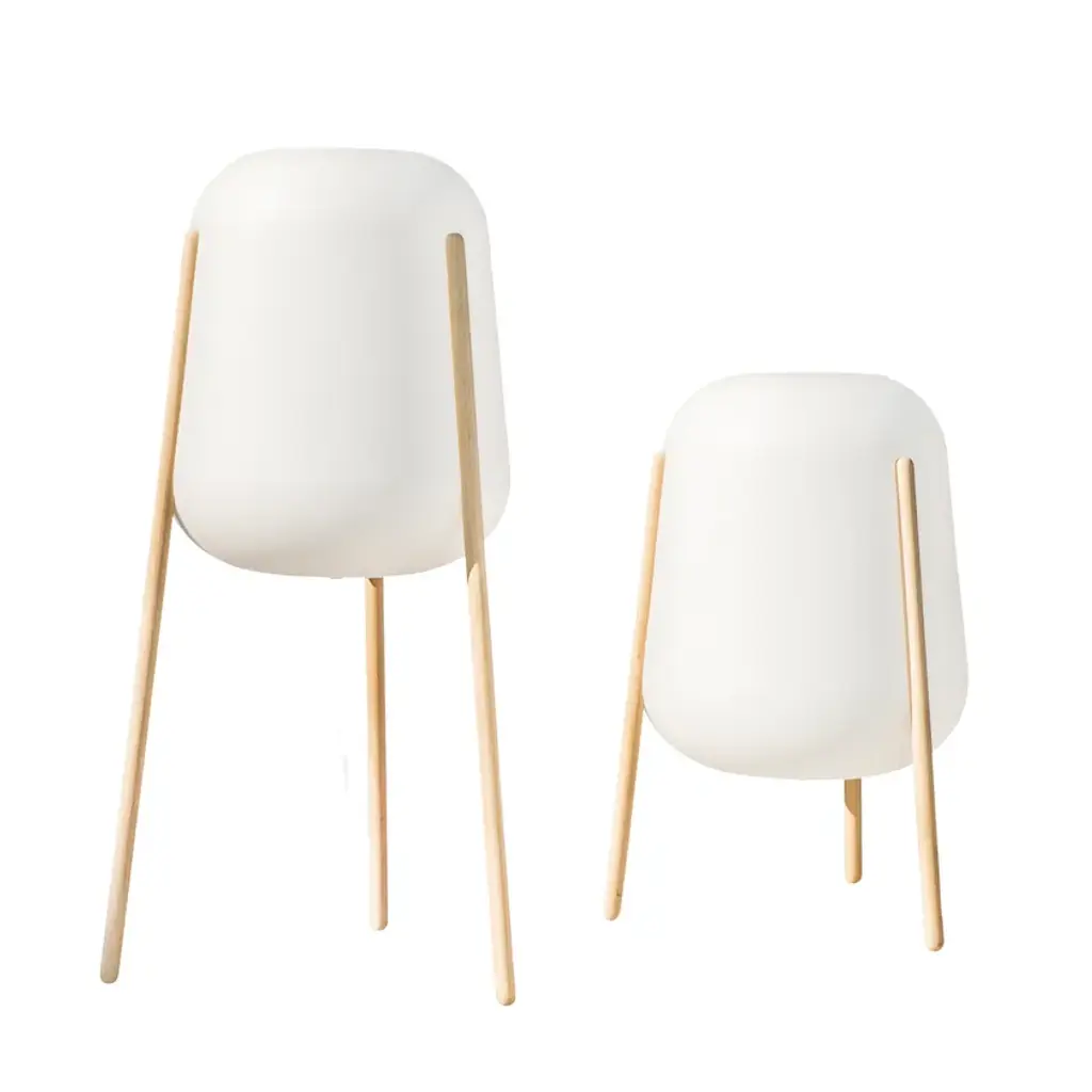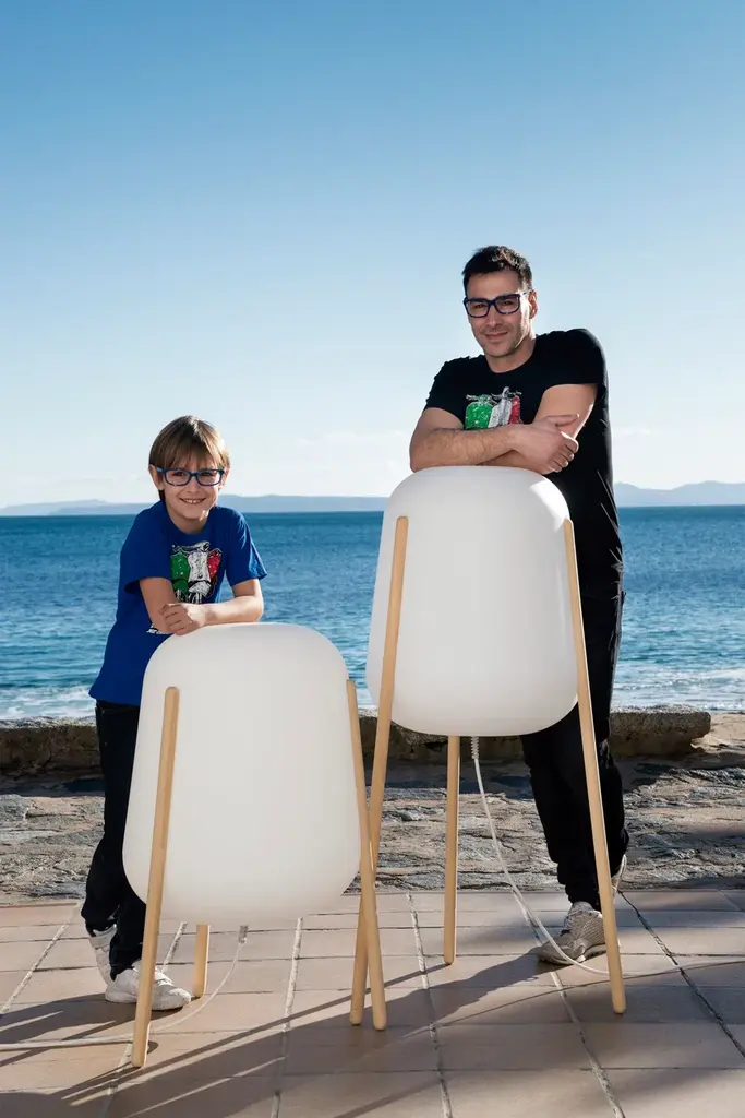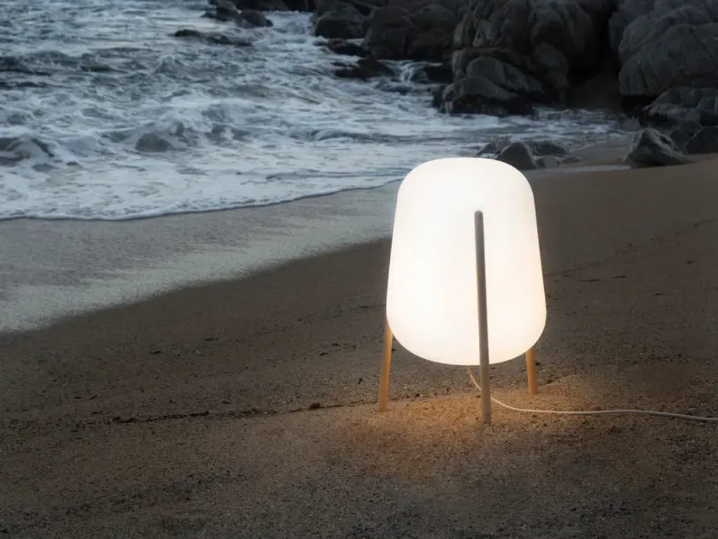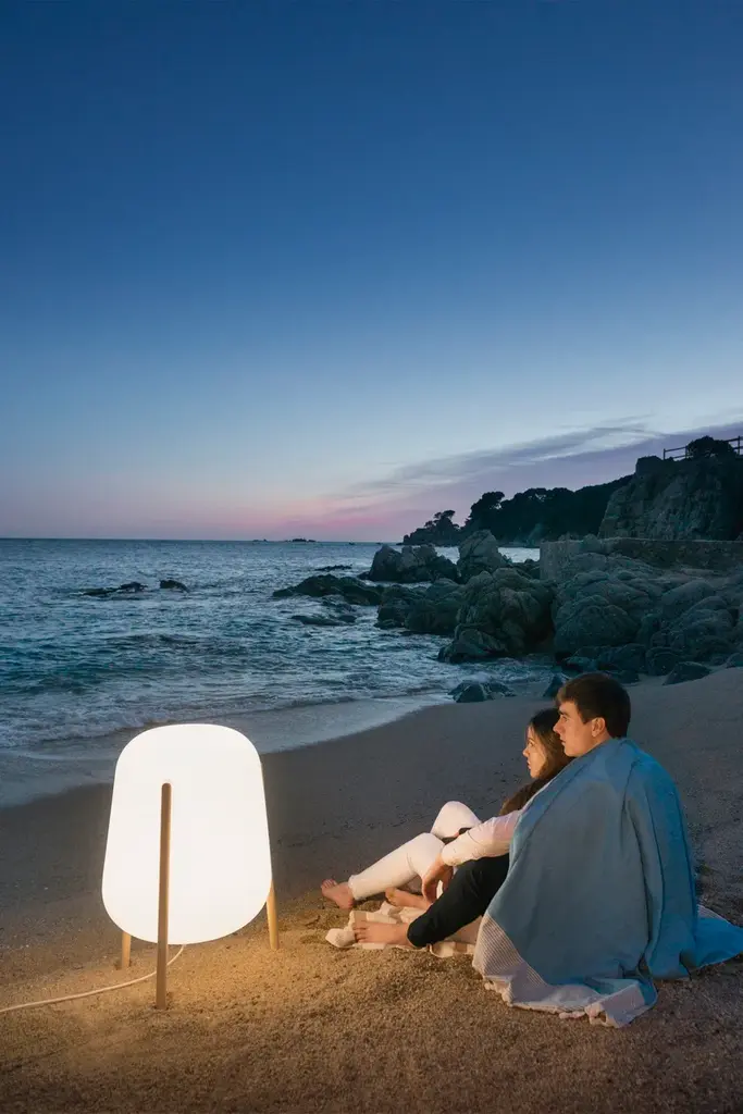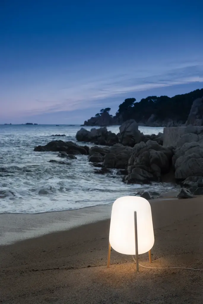 Like a sweet and syrupy cloud suspended in space, illuminating in all directions, simple, without stridencies or excess, which brings warmth, comfort, life, light, ... La Llum de Calma.Lamp in PE rotationally molded with lighting equipment suitable for outdoor use. Structure in iroko wood.