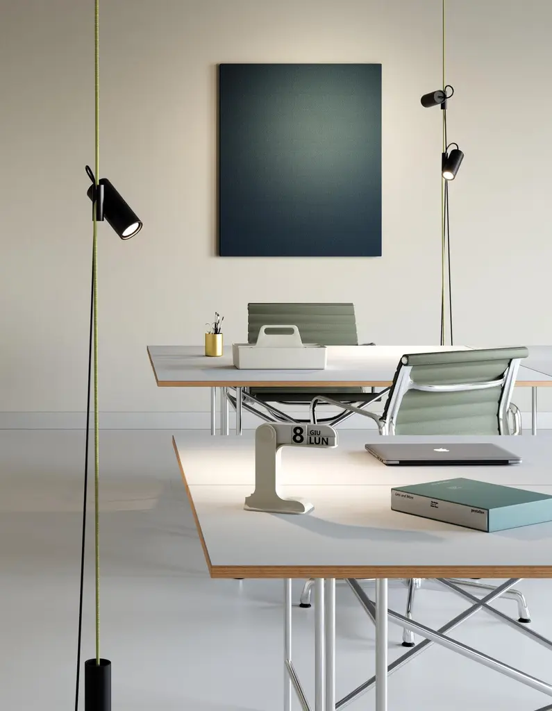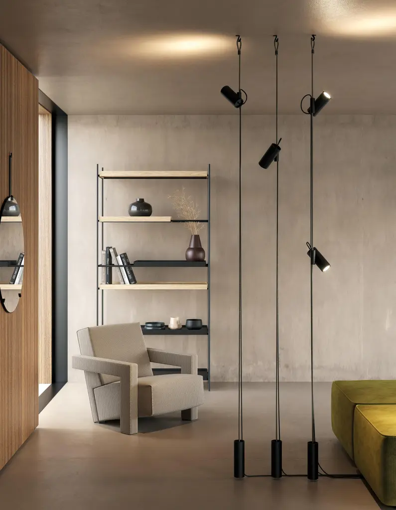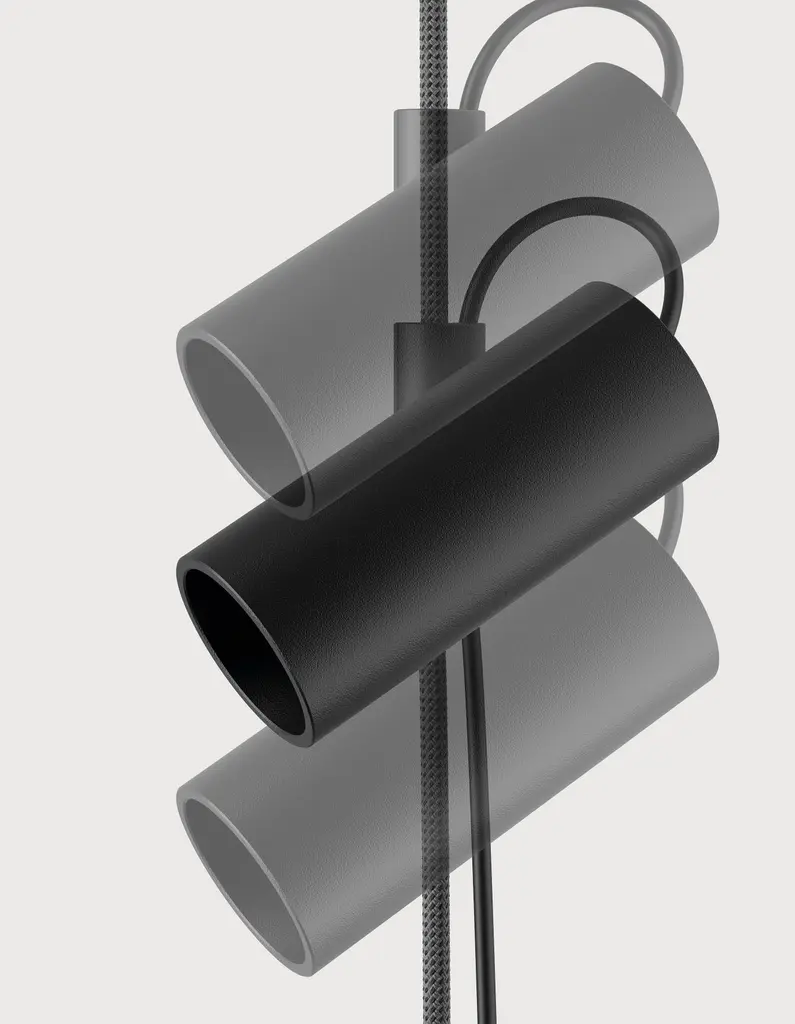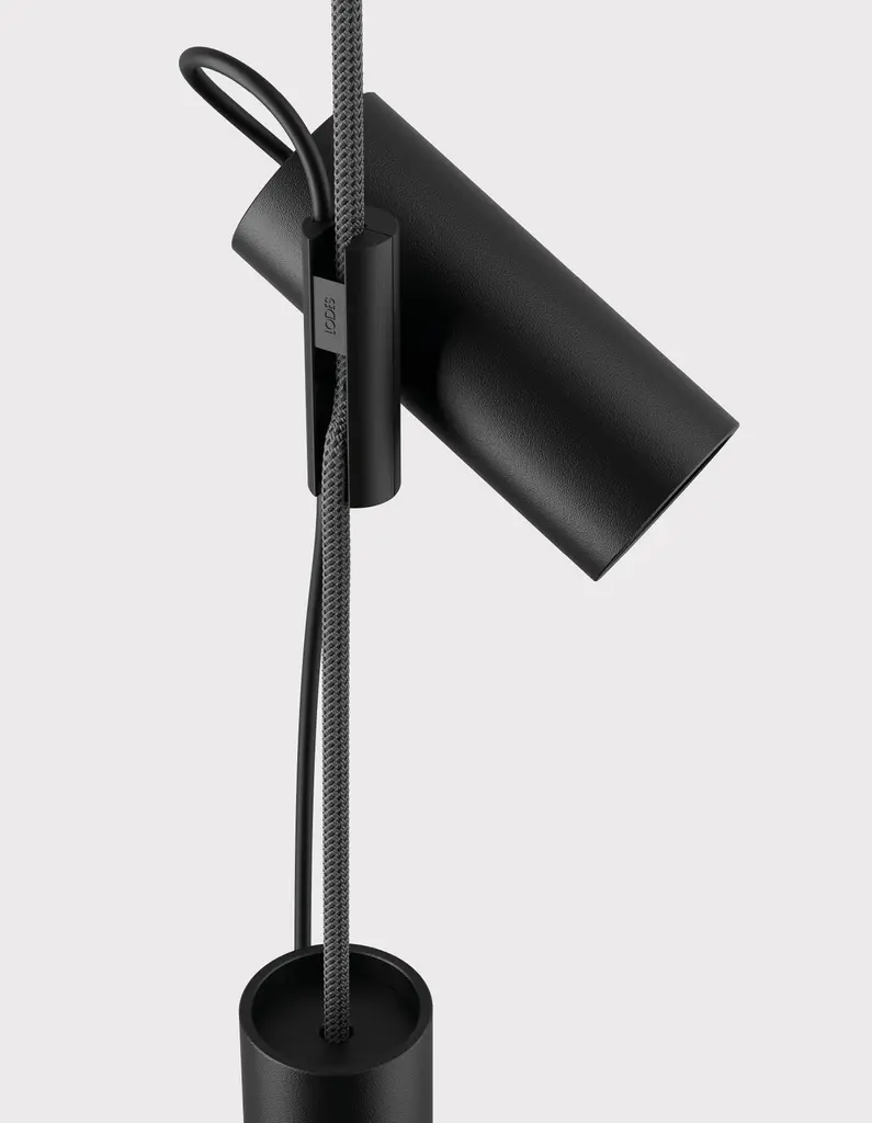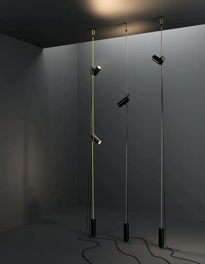 Inspired by the function of the jam cleats found in sailing boats, Cima —a nautical rope in Italian— is a “suspended” lamp characterised by a ceiling-to-floor rope, a sleek and highly functional design element. A joint that holds the lamp body slides vertically along the rope, while the counterweight allows to manage any excess rope. The simple cylindrical shapes and the black colour of these elements highlight the three brilliant finishes of the rope, vibrant accents to suit any interiors and décor mood.Cima is a “suspended” lamp, conceived as a practical lighting solution that can be rapidly altered to meet the needs of those who use it. Cima’s hallmark is a ceiling-to-floor rope, a graphic and functional element with an eyelet that allows it to be fixed to the ceiling. An injection moulded polymer joint slides vertically along the rope and locks at any desired point. The lamp body resting on the joint swivels to bring light where it is needed. The counterweight enables to readjust any excess of rope for lower ceilings. The switch button is placed on the power cord for easy use.With their cylindrical shapes and sophisticated yet technical textured black finish, the lamp body, the joint and the counterweight accentuate the colours of the rope —gold, yellow or silver. The versatility of configuration and the GU10 commercial light bulb socket make Cima a flexible lamp that can be adapted to the lighting needs of any environment. With Cima, lighting can be easily shared and regulated, creating a sense of inclusiveness within the light wavelength range.Available in different options:Finish:• Silver• Gold• YellowDIMENSIONS:Ø 6 x H. 430 cm