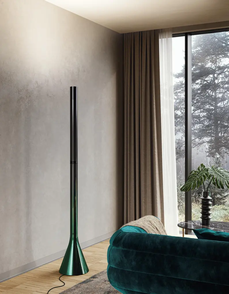 Taking its name from the Italian word for a ‘quaver’ or ‘eighth’, the floor lamp Croma reflects the dynamism of the musical note in its slender frame. In contrast to the classic floor lamp, which typically opens out at the top, Luca Nichetto turned the frame on its head to create a revolutionary product. Immediate in its function, elegant in the four available finishes, Croma’s powerful light output and dim-to-warm function make it suitable for a variety of environments.Croma’s slender metal frame, which dispels washes of light upwards across the wall and ceiling, reflects the dynamism of the musical note from which it derives its name.Reaching 186cm in total, the floor lamp designed by Luca Nichetto features a conical base that provides stability and a sleek body which casts a powerful ray of light from its LED source. A ring conveniently positioned halfway up the stem allows the user to switch the lamp on and off, and to utilise its dim to warm function, which extends from 2200 to 3200 kelvin.Croma is available in four unique finishes. The metallic ombré effects fade from green to black and from bronze to nickel, their gradient referencing the way the light can radiate upwards against a wall. The two matte shades, in solid white and black, have a texturised finish that would be well suited to any residential and commercial setting.Croma is an elegant yet striking product that embodies Lodes’ ethos – considered design with powerful and personalised lighting that prioritises the end user.Available in different options:Finish:• Bronze• Green• Matte White• Matte BlackDIMENSIONS:Ø 30 x H. 186 cm