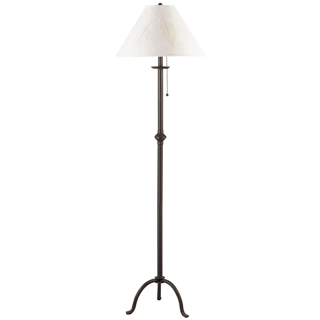 The mark of a talented designer is shown in the makeup of our Lohn Floor Lamp. The ornamentations on the thin stem have a balance to them that pleases the eye—three upturned fluted motifs pointing toward the shade and one pointing toward the simple stacked base. Topping the cast-iron piece off, above the beige poplin shade, is a finial that has the same tonal qualities as the body of the lamp, which reads as black but has the subtlest of hints of dark brown texture to it.