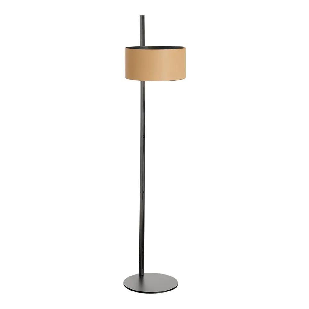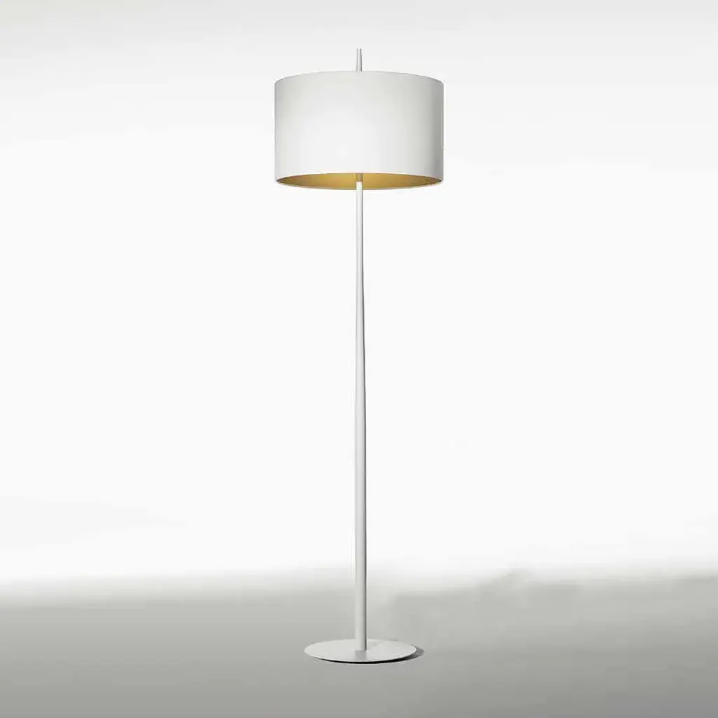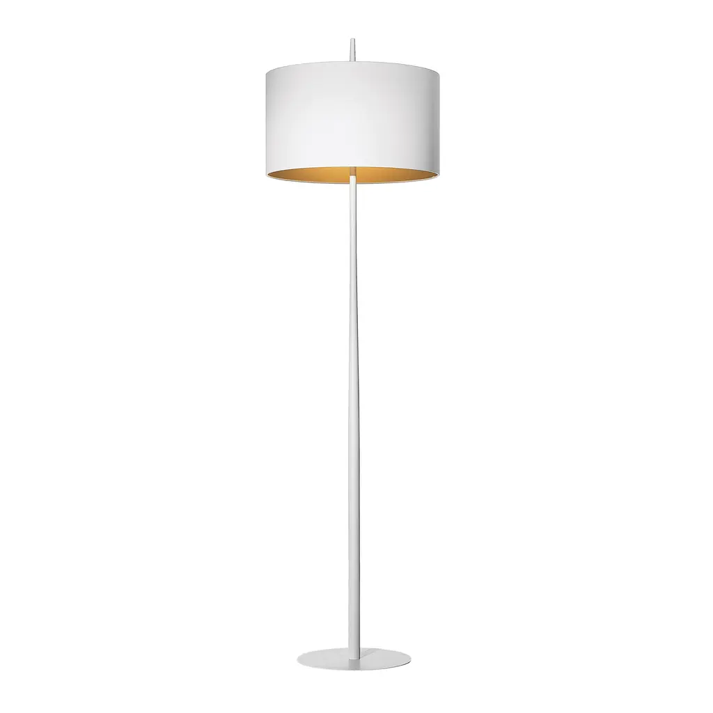 Floor lamp with metal body and fabric shade. Available in two finishes: Black mattee textured body with opaque black shade, or white mattee textured body with an opaque white shade. Gold textile cable. Shade interior is gold. Features