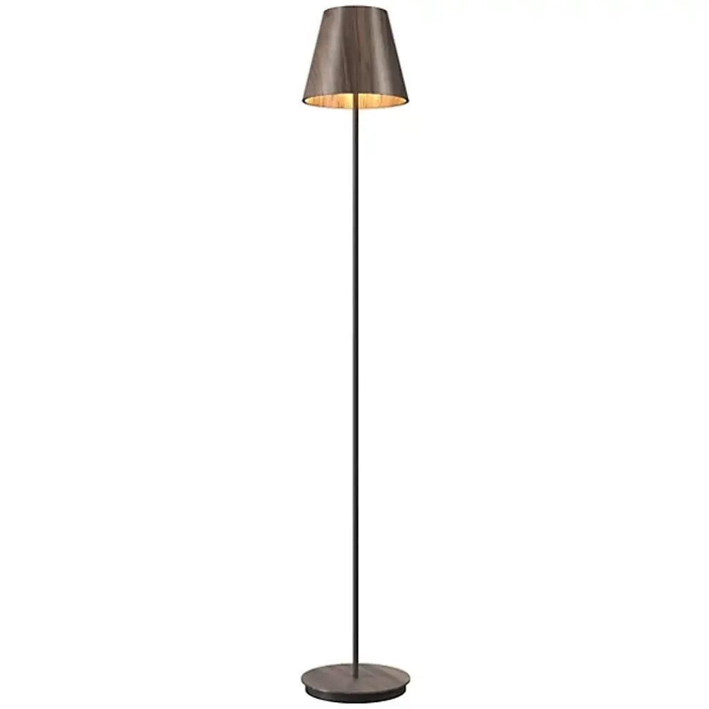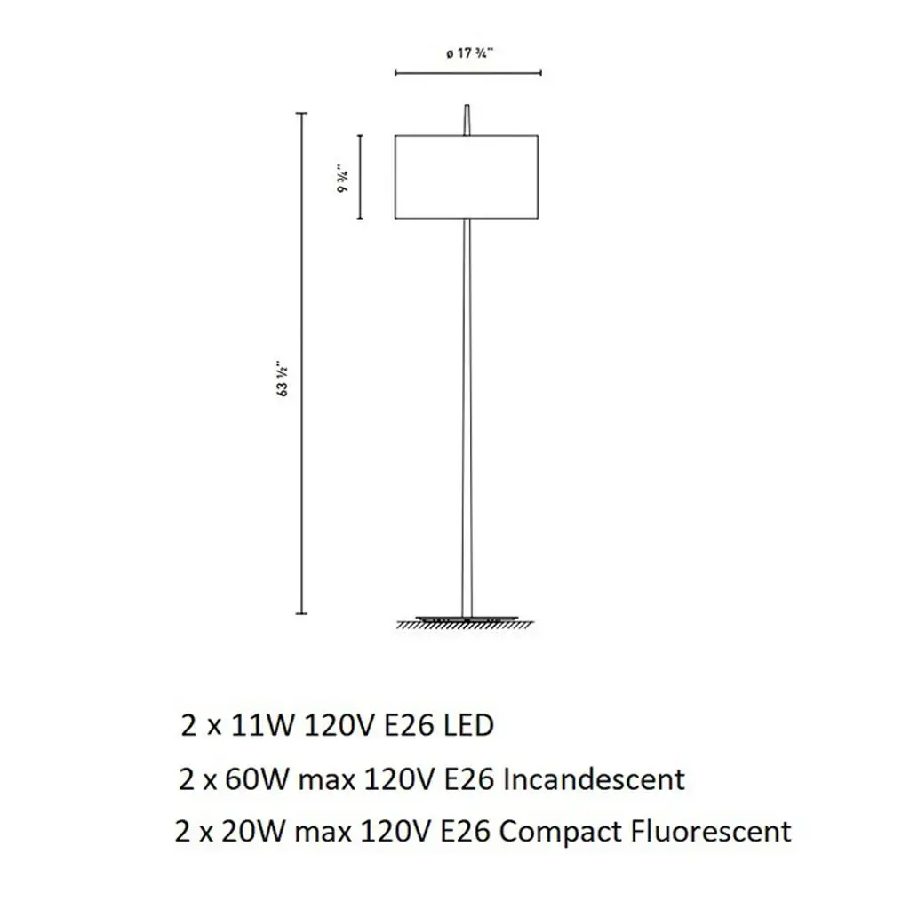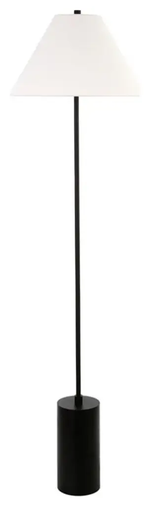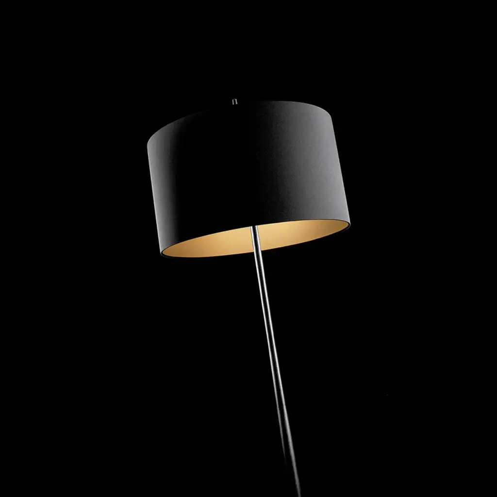 Floor lamp with metal body and fabric shade. Available in two finishes: Black mattee textured body with opaque black shade, or white mattee textured body with an opaque white shade. Gold textile cable. Shade interior is gold. Features