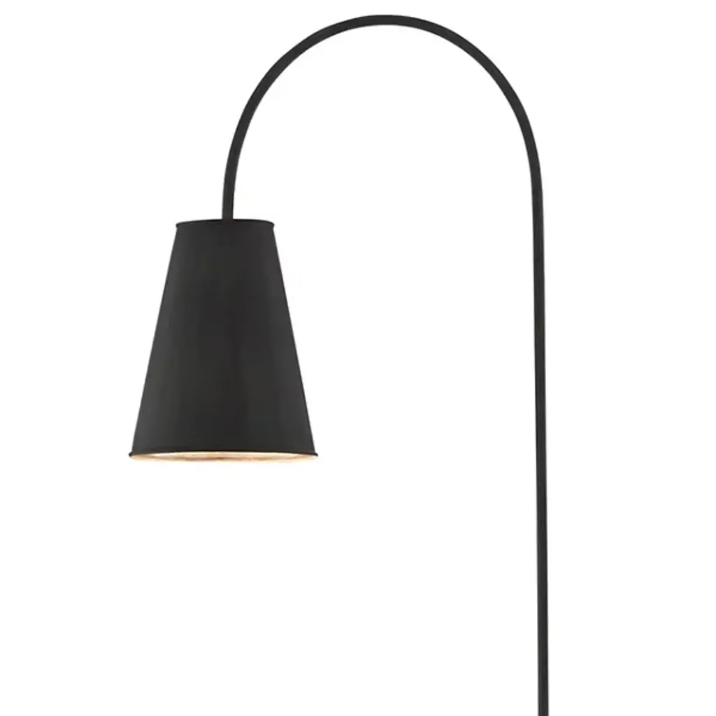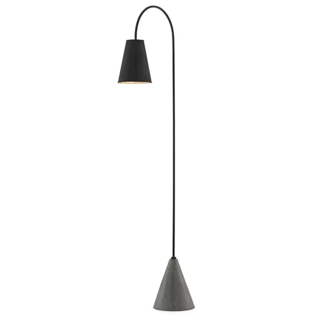 The Lotz Floor Lamp from Currey & Company has a shepherd's crook silhouette shaped from wrought iron. The lamp's concrete base provides stability and visual contrast, while the cone-shaped shade directs light with precision. A leaf-finished interior amplifies the lamp's luminosity, filling the room with high-quality illumination. This handcrafted piece showcases the artisan's skill, with each lamp possessing unique characteristics. The Lotz Floor Lamp stands as a testament to transitional design, complementing a variety of interiors.