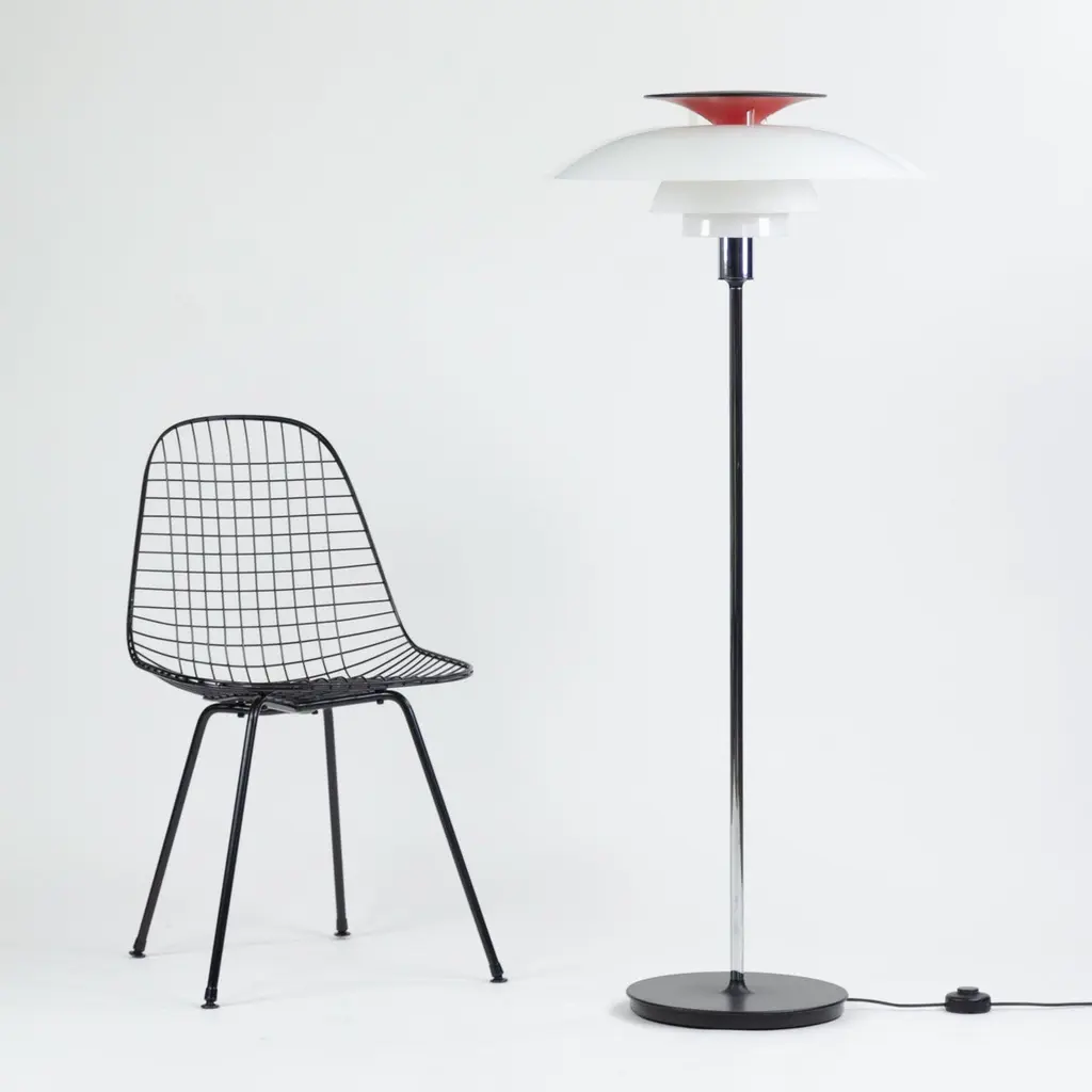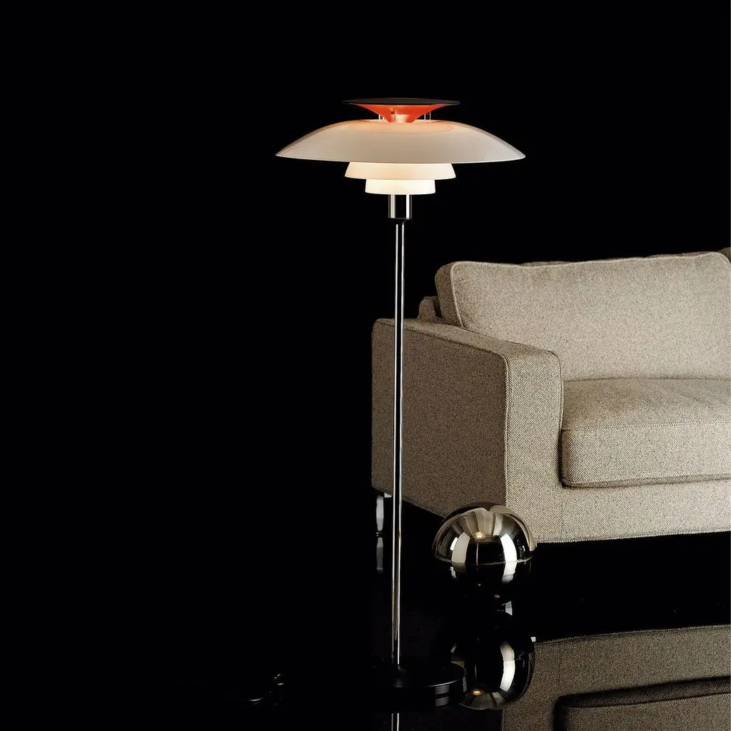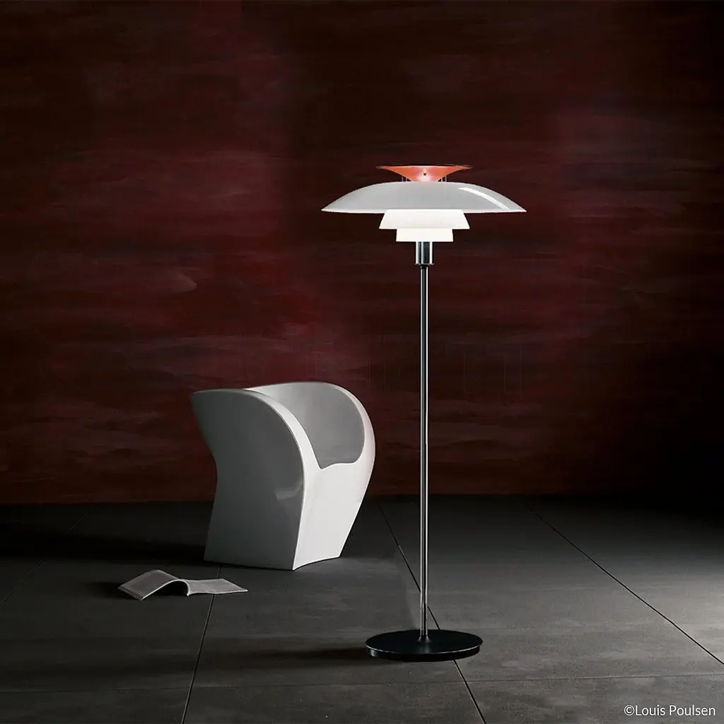 Louis Poulsen, metal floor light by Poul HenningsenMeasures: Width x height x length (mm)550 x 1315 x 550, 7.4 kgMaterial: Shades: white opal acrylic and polycarbonate, stem in bright chrome plated steel. Cord length: 2.6 m. Switch: On the cord. Cord type: Black plastic with plug.