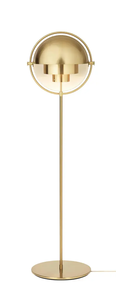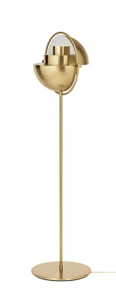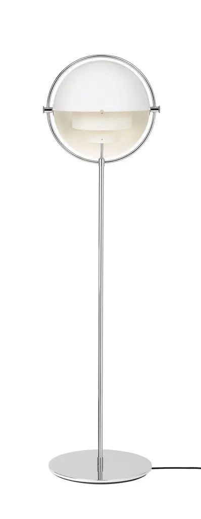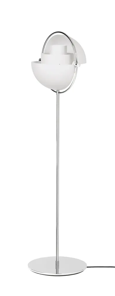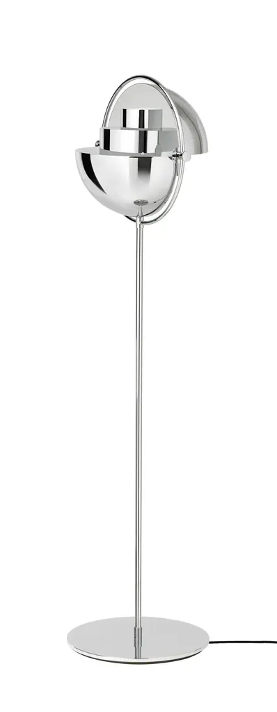 Louis Weisdorf 'Multi-Lite' Floor Lamp in Chrome for GUBIDesigned in 1972 by Weisdorf, this is an authorized re-edition by GUBI of Denmark who meticulously reproduces his work with scrupulous attention to detail and materials that are faithful to the original specifications. This highly sculptural and geometrical floor lamp is comprised of two mobile shades that can be rotated independently to change the direction of the light as well as the look of the lamp. Executed in metal with painted shades. Price is per item. Available in chrome, white / chrome, black / brass, and all brass. This listing is for the chrome variant. In-stock lead time 4-5 weeks. Allow additional 2-3 weeks for items not in stock. Can take up to 12 weeks.CUL, UL Listed. Accommodates a single 60 watt medium base incandescent bulb (higher with LED). Ships with 13 feet inches of fabric-covered cord.