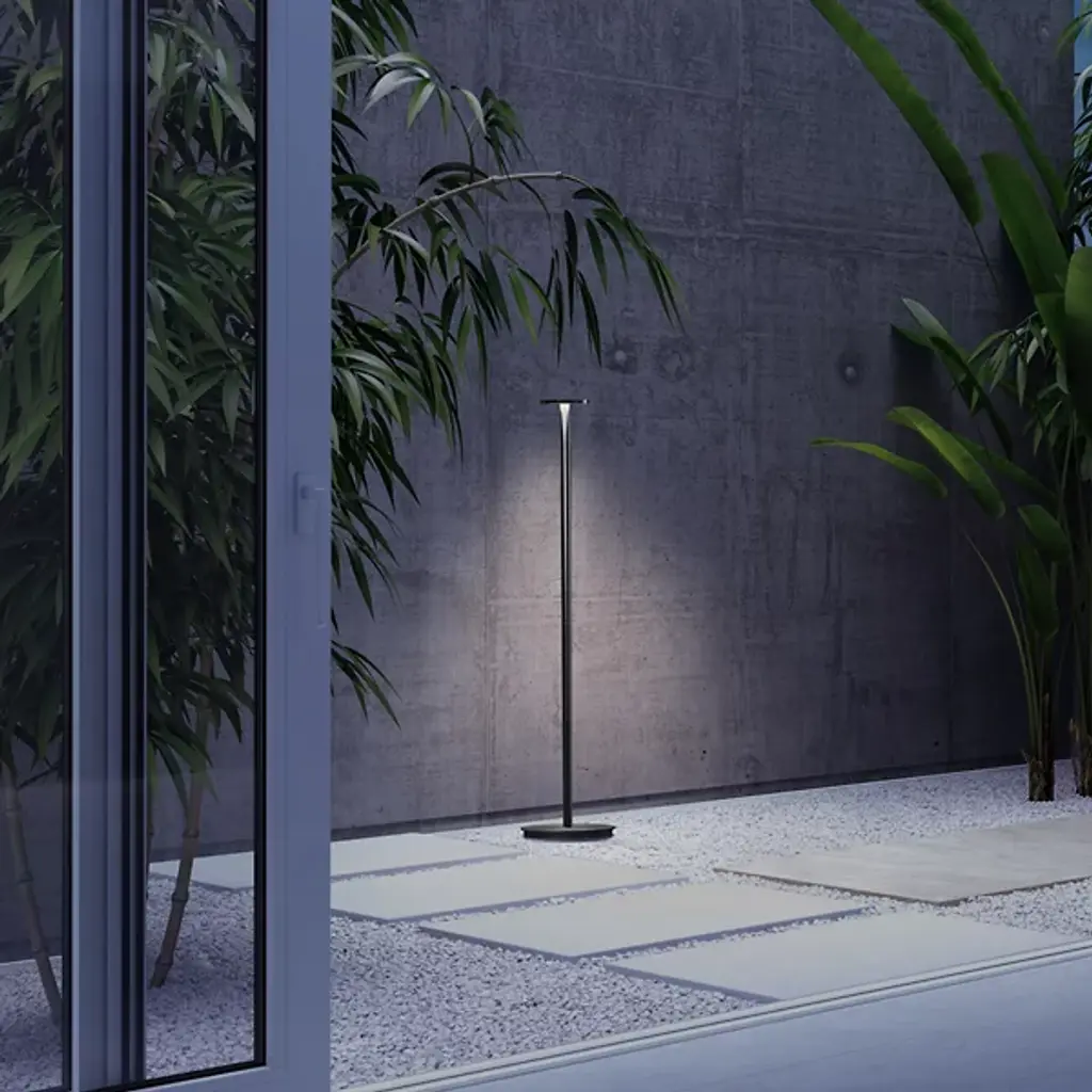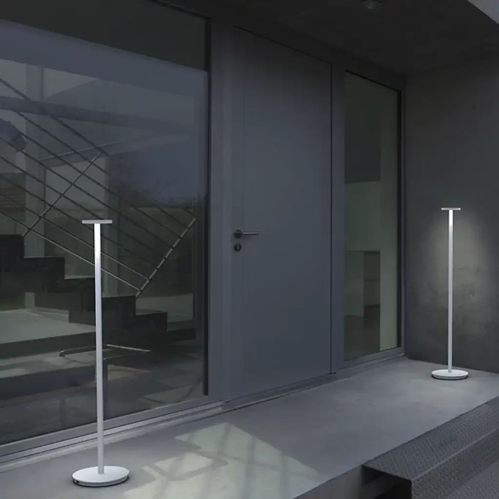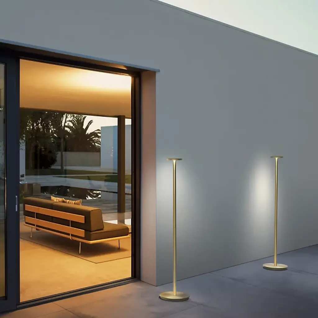 Add smooth style and easy illumination to contemporary spaces with the sleek and appealing lines of the Luci Rechargeable LED Floor Lamp from Pablo Designs. A captivating structure done in machined aluminum, it sends up a central column from a broad disc base, terminating in LED lamping blazing down from a smaller disc housing above. An optical switch above the lamping controls a series of different-temperature dimmer settings, while a chargeable battery means the fixture can provide ample illumination wherever a touch of customizable light is required, whether indoors or outside.