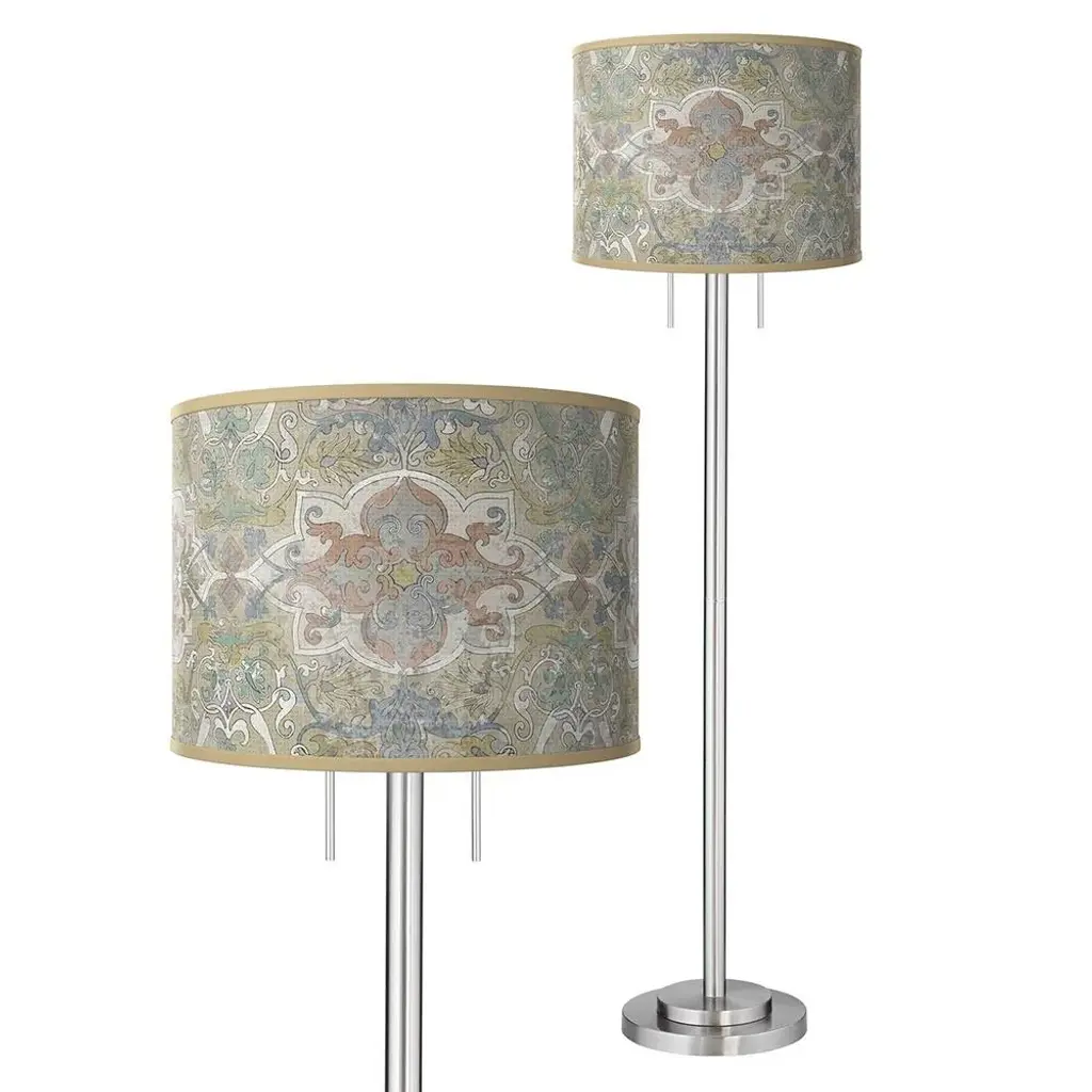 PRODUCT DETAILS: Overall: 63" high. Shade is 18" wide x 12 3/4" high. Base is 12" wide. Takes two maximum 100 watt bulbs (not included). Pull chain switches. Sleek contemporary floor lamp. Custom made-to-order drum shade with Lucrezia giclee printed pattern. Brushed nickel finish over metal construction. DESCRIPTION: The Garth brushed nickel finish floor lamp takes a simple base design and pairs it with a striking printed drum shade for a burst of style.