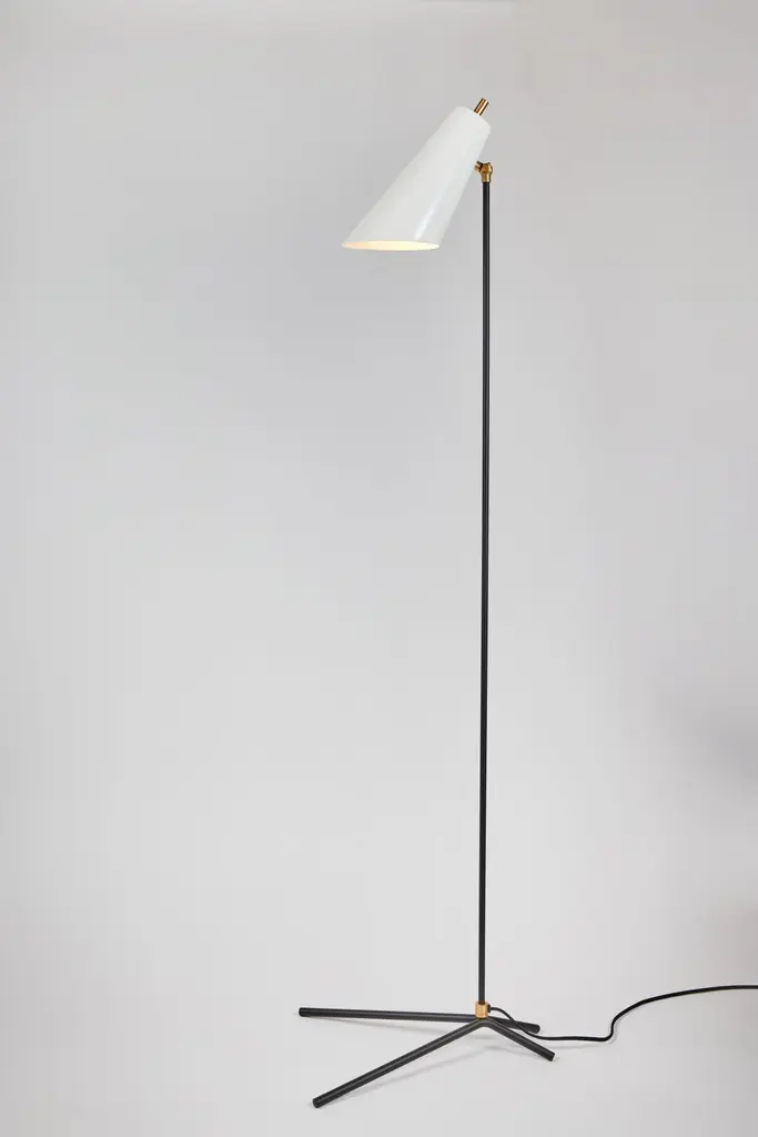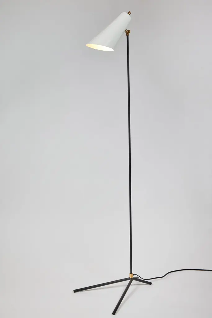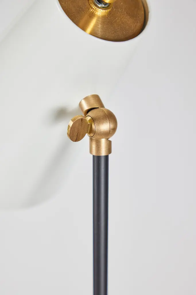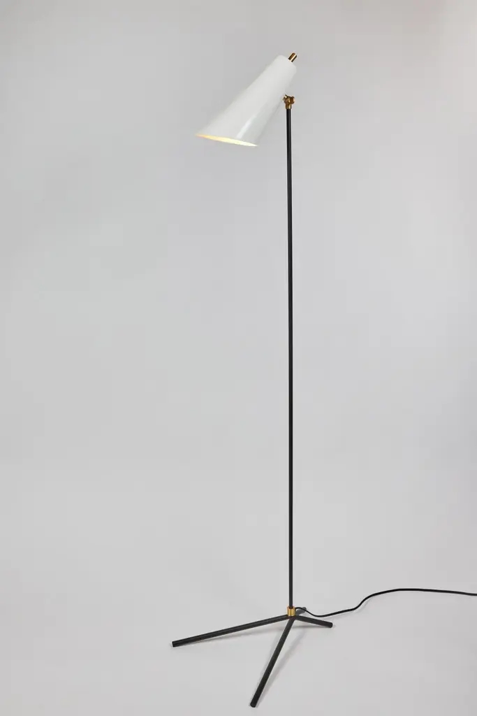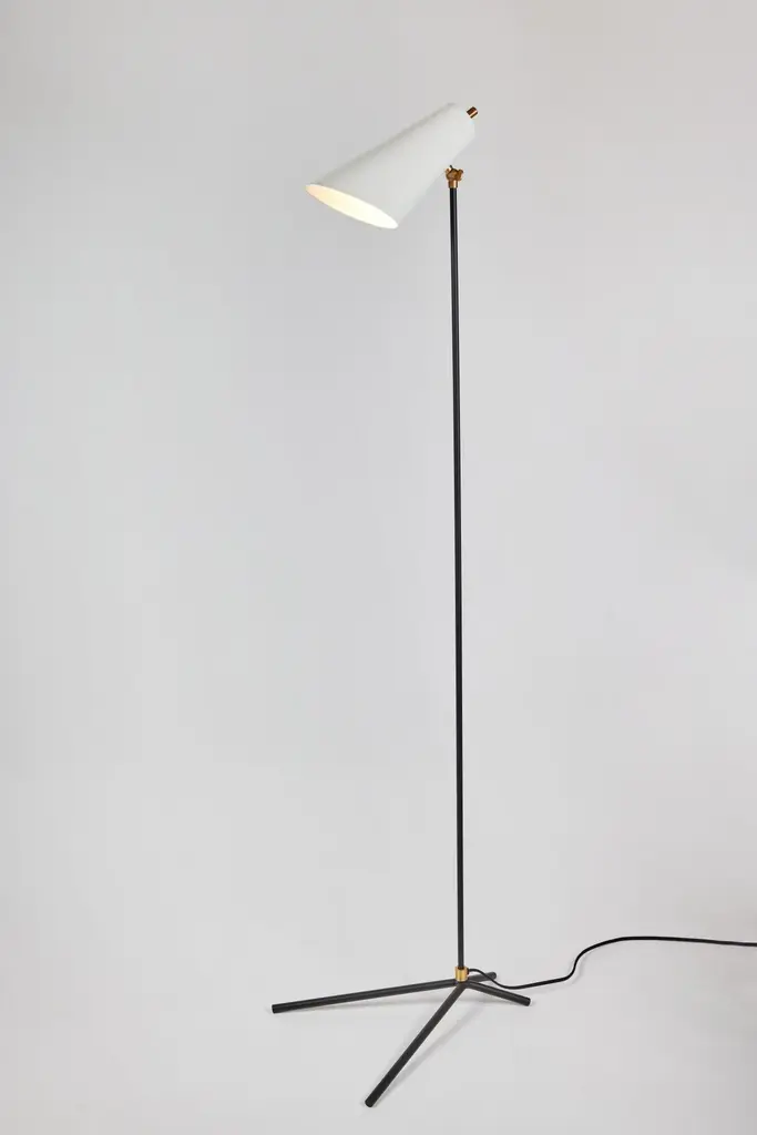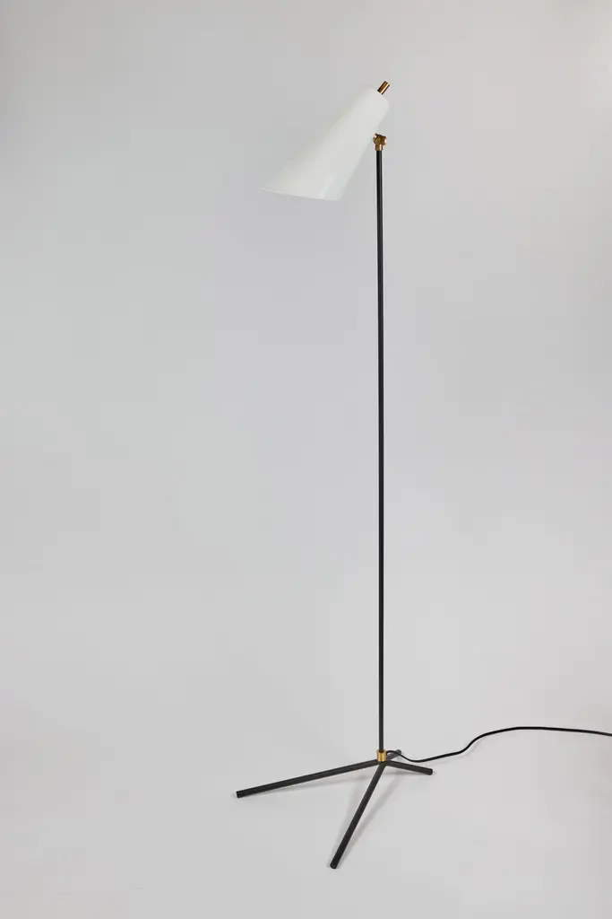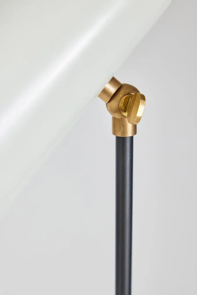 "Lucy" floor lamp in brass and metal by Alvaro Benitez. Hand-fabricated by Los Angeles based designer and lighting professional Alvaro Benitez, this UL listed and highly refined floor lamp is reminiscent of the iconic mid-century Italian designs of Arteluce and Stilnovo. Executed in black and white metal, shade can be rotated left, right, up and down for a flexible variety of lighting options.Price is per item. 1x lamp in stock and available for immediate shipment. Available to order in unlimited quantities with 2-3 week lead time. Out of stock lead time can add 6 weeks or more. Inventory and lead time is subject to change without notice. Please contact us for current lead time prior to placing time-sensitive orders. Accommodates a single medium base E26 maximum 60 watt equivalent LED bulb (bulb not included). UL listed.Please note that the brass parts of this lamp are fabricated in unlacquered brass. They will naturally patinate over time and can already show varied signs of patination through exposure to the elements, handling, etc.Made to order. All sales are final.